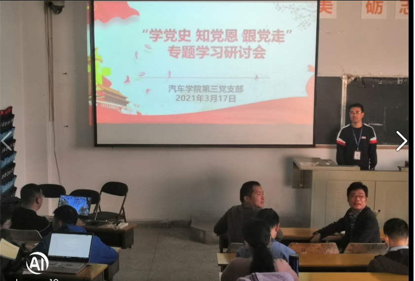 根據(jù)學(xué)院“再學(xué)習(xí)、再調(diào)研、再落實(shí)”活動(dòng)工作部署要求,深入開展黨史學(xué)習(xí)教育,2021年3月17日下午,汽車學(xué)院第三黨支部于汽西22號(hào)樓第二階梯教室教室開展“學(xué)黨史 知黨恩 跟黨走”專題學(xué)習(xí)研討會(huì)。
