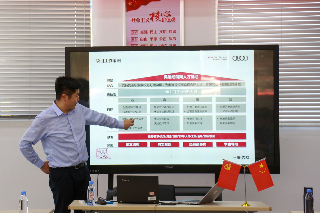 本次會議由汽車學院的林可春副院長和奧迪售后服務(wù)部的張志軍老師共同主持,交流會共三個議題分別為:奧迪職業(yè)學校項目總體介紹、近2年奧迪班學生實習,就業(yè)狀態(tài)、學生的選育用留等具體工作交流。