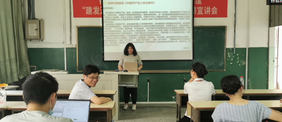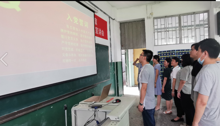為了迎接黨的100周歲生日,由支部書記朱劍寶同志帶領(lǐng)大家重溫入黨誓詞,本支部最年輕的黨員黃丹粟同志作為青年教師代表重溫入黨志愿書。拉開了本次學習活動的序幕。與往常不同的開場方式將本次學習活動推向一個小高潮,充分調(diào)動了黨員學習的熱情。