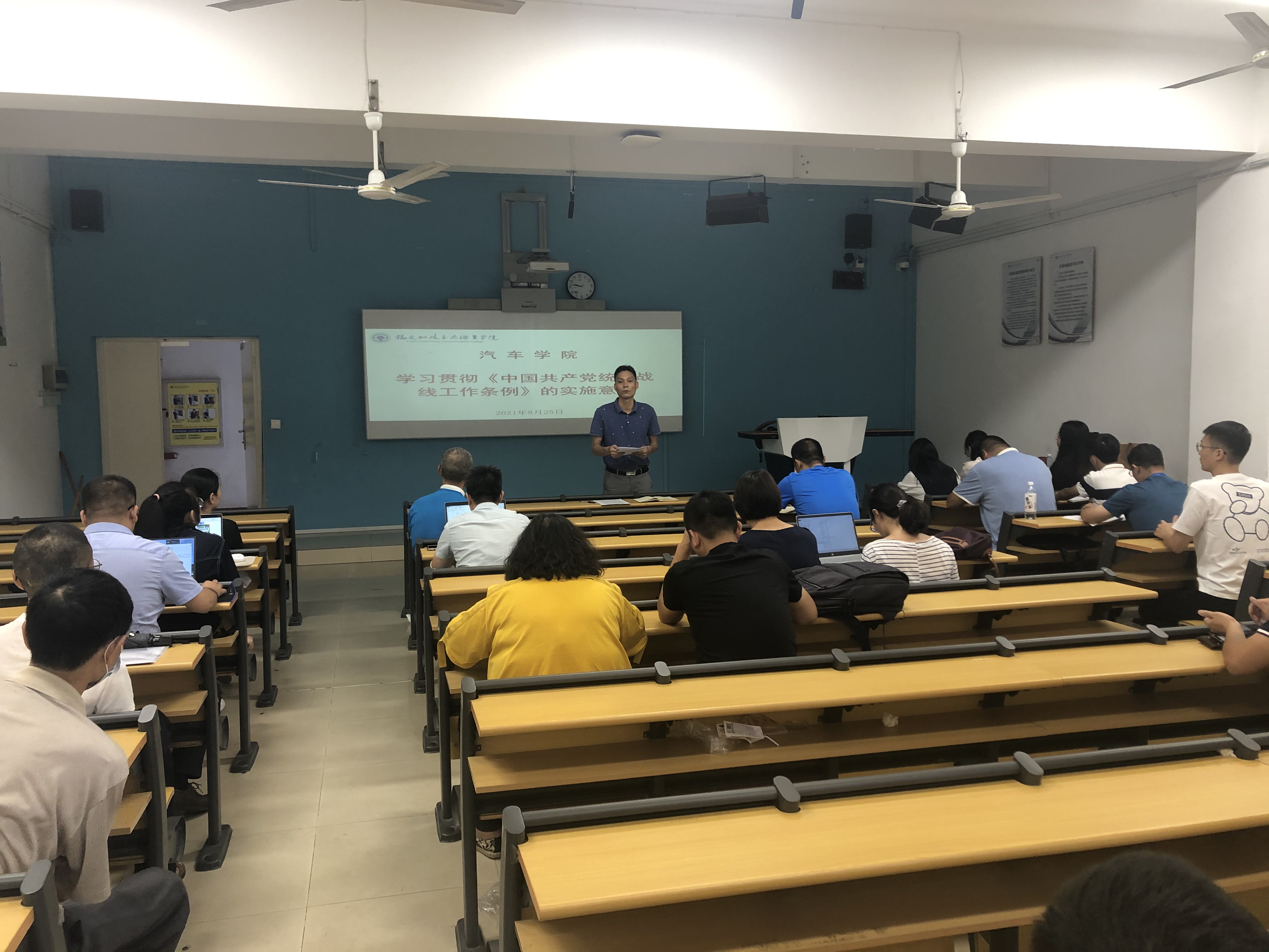 8月25日,汽車學(xué)院黨總支召開全體教職工大會,組織學(xué)習(xí)中共福建省委印發(fā)《關(guān)于貫徹〈中國共產(chǎn)黨統(tǒng)一戰(zhàn)線工作條例〉的實施意見》(以下簡稱《實施意見》),學(xué)院領(lǐng)導(dǎo)及全體教師、輔導(dǎo)員參加本次會議。