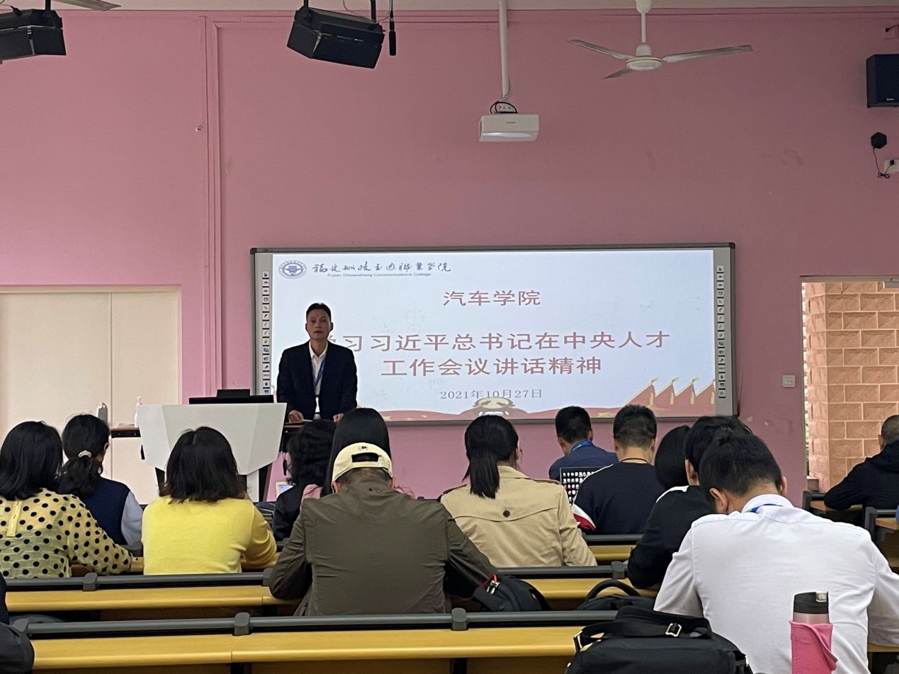 10月27日下午,汽車學(xué)院黨總支召開全院教職工大會,學(xué)習(xí)貫徹習(xí)近平總書記在中央人才工作會議上重要講話精神,全體教職工參加會議,學(xué)院黨總支書記蔡華錦主持會議并講話。