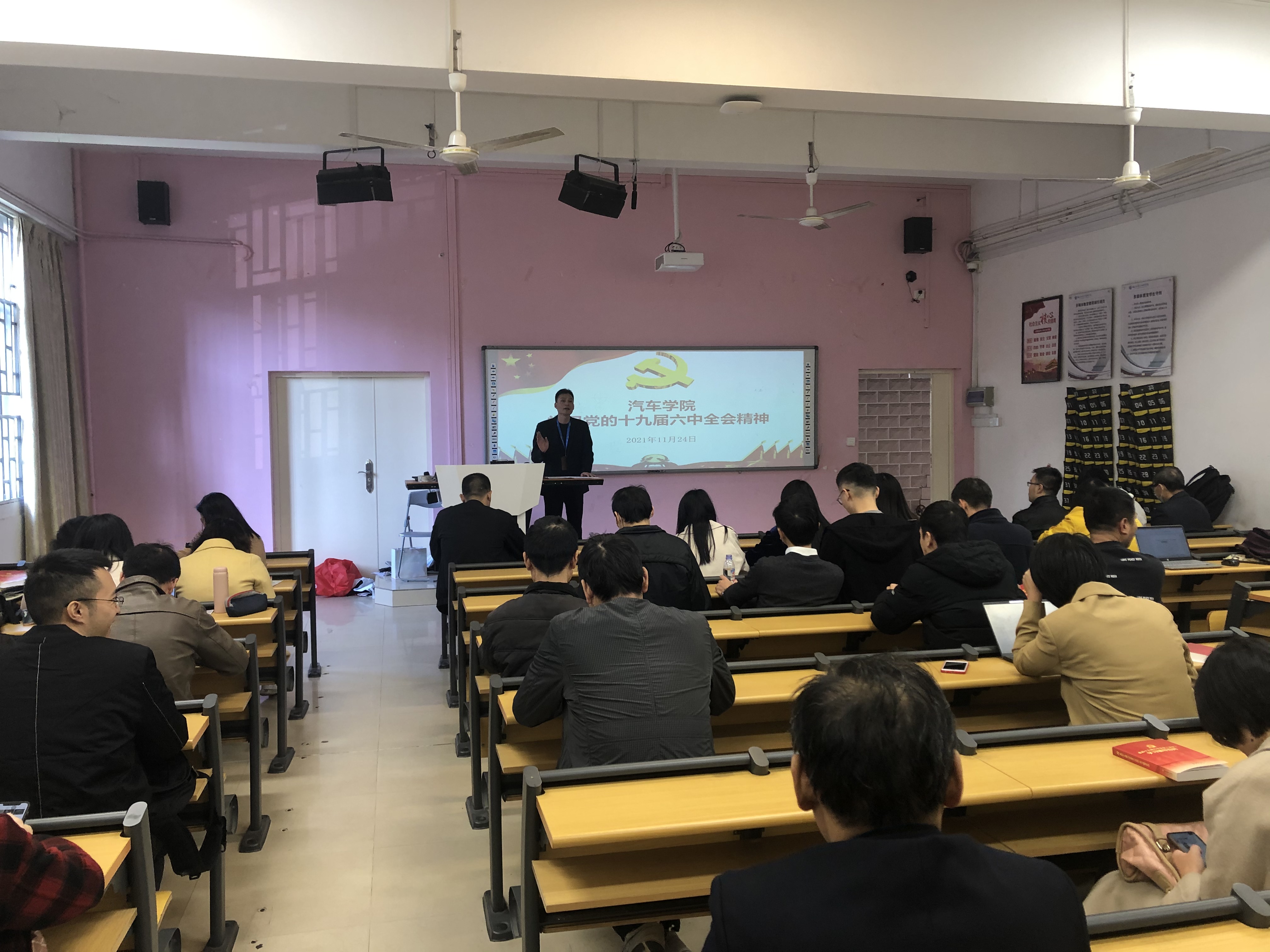 11月8日至11日,中國共產黨第十九屆中央委員會第六次會議在北京召開。這次全會是在中國共產黨成立100周年的重要時刻,在“兩個一百年”奮斗目標歷史交匯的關鍵節(jié)點上召開的一次重要會議。11月24日下午,汽車學院組織全體黨員、教職工召開學習大會,專題學習貫徹黨的十九屆六中全會精神。汽車學院黨總支書記主持學習并講話。