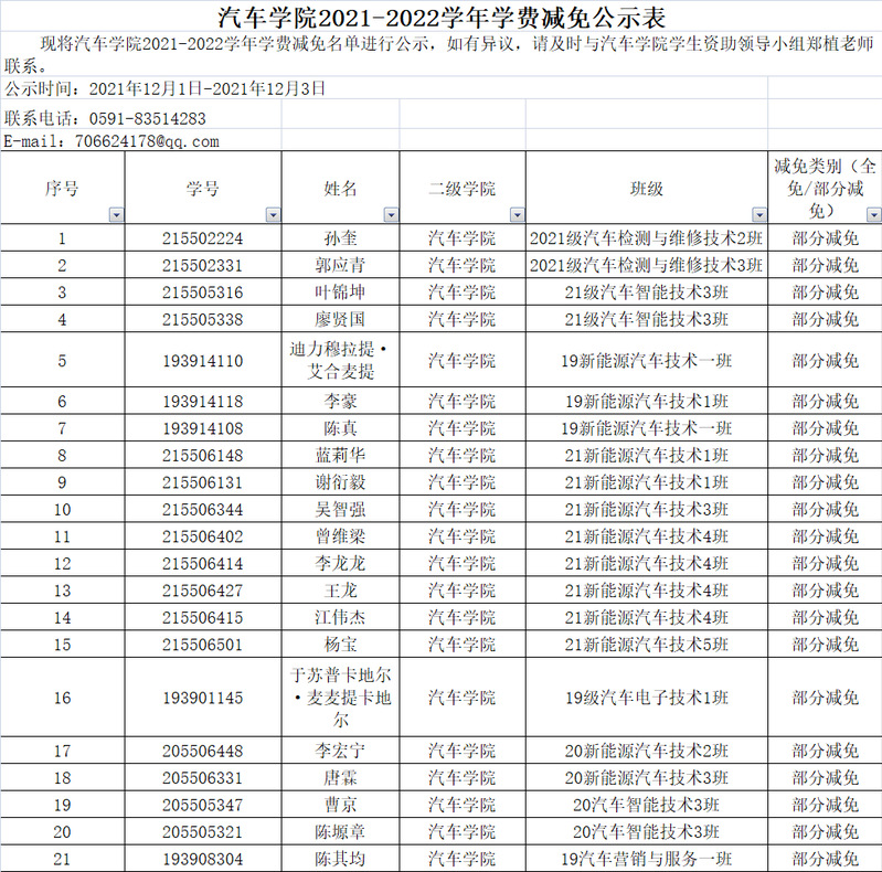 汽車學(xué)院2021-2022學(xué)年學(xué)費減免公示表