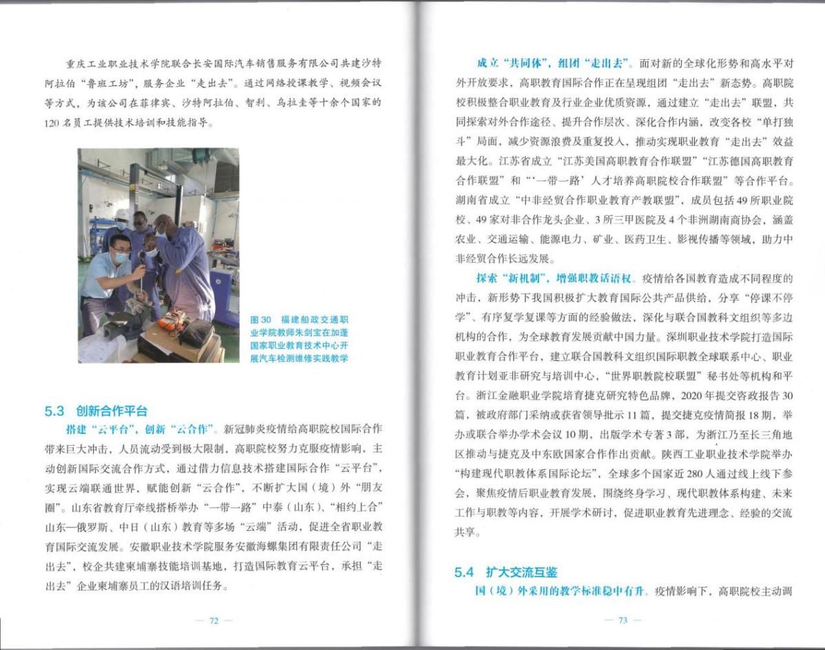 近日,由中國教育科學(xué)研究院、全國職業(yè)高等院校校長聯(lián)席會議編制的《2021中國職業(yè)教育質(zhì)量年度報告》正式公布。我校朱劍寶老師在“一帶一路”國家加蓬國家職業(yè)技術(shù)教育中心開展汽車檢測維修實踐教學(xué)入選中國職業(yè)教育質(zhì)量年報第25篇案例《多措并舉,服務(wù)國際產(chǎn)能合作》。