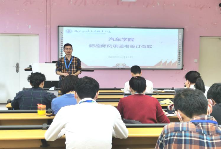 隨后,汽車學院院長蘇慶列組織全體教師簽訂了《福建船政交通職業(yè)學院汽車學院教師師德師風承諾書》。蘇慶列院長強調(diào),汽車學院全體教職工在師德師風建設(shè)中要做到四個方面:一要提高思想站位,注重提升職業(yè)道德素養(yǎng);二要認真學習文件精神,積極傳播正能量;三要密切關(guān)注網(wǎng)絡(luò)輿情,積極選樹典型;四要堅守廉潔底線,不越紀律紅線。全體教職工要經(jīng)常性重溫《承諾書》內(nèi)容,認真踐行承諾,不斷加強師德師風建設(shè),肩負起立德樹人教書育人的光榮職責,發(fā)揮自身的積極性、主動性和創(chuàng)造性,促進汽車學院的高質(zhì)量發(fā)展。