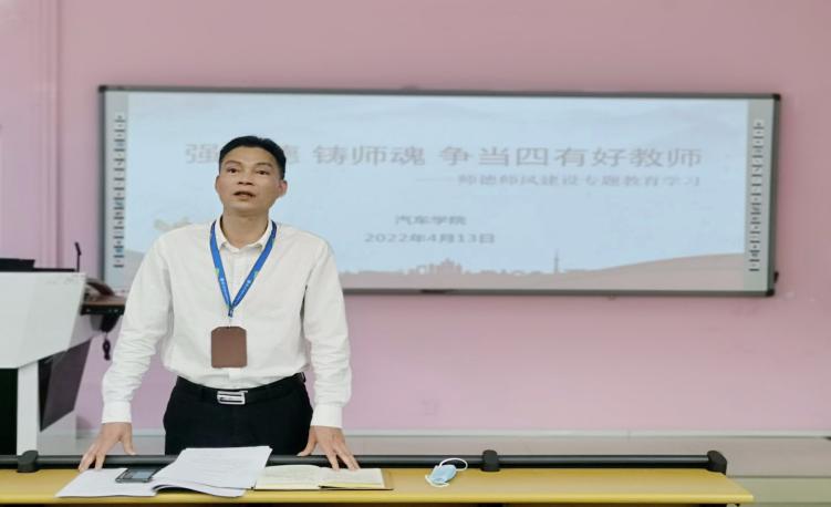 4月13日,汽車學院召開全體教職工大會,以“強師德,鑄師魂,爭當四有好教師”為主題進行師德師風建設(shè)專題教育學習。學院黨總支書記蔡華錦主持會議,全體教職工參會。