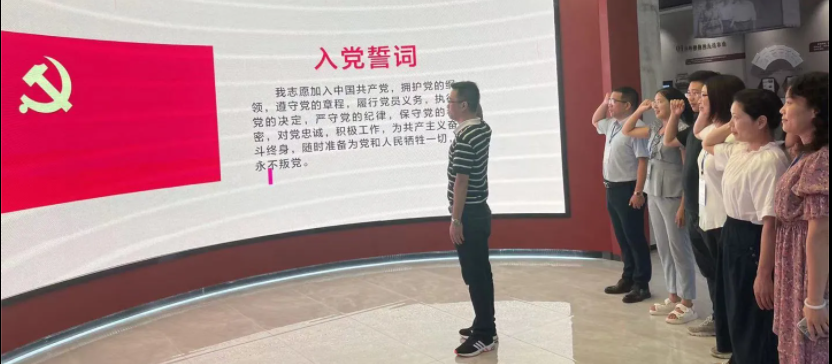 最后,在鮮紅的黨旗面前,由支部書記朱劍寶同志帶領全體黨員重溫入黨誓詞。