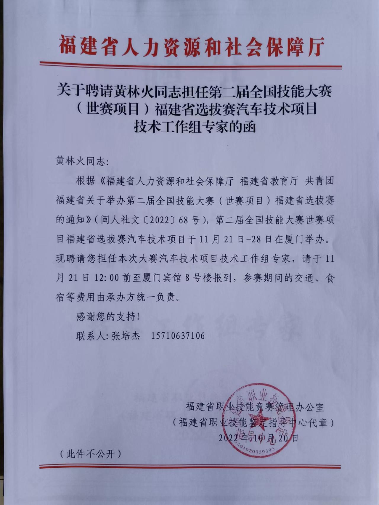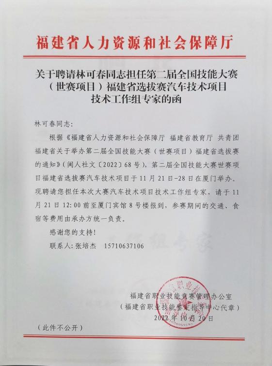 2022年11月25、26、27日,第二屆全國(guó)技能大賽(世賽項(xiàng)目)福建選拔賽汽車(chē)技術(shù)項(xiàng)目在廈門(mén)技師學(xué)院順利舉行。汽車(chē)學(xué)院林可春副院長(zhǎng)與技能大師工作室成員黃林火老師作為技術(shù)專(zhuān)家全程主持了比賽的出題、工位布置、裁判員培訓(xùn)等工作,為選拔賽的順利進(jìn)行做了大量重要工作,受到福建省人社廳職業(yè)技能鑒定指導(dǎo)中心及賽項(xiàng)承辦單位的肯定與好評(píng)。