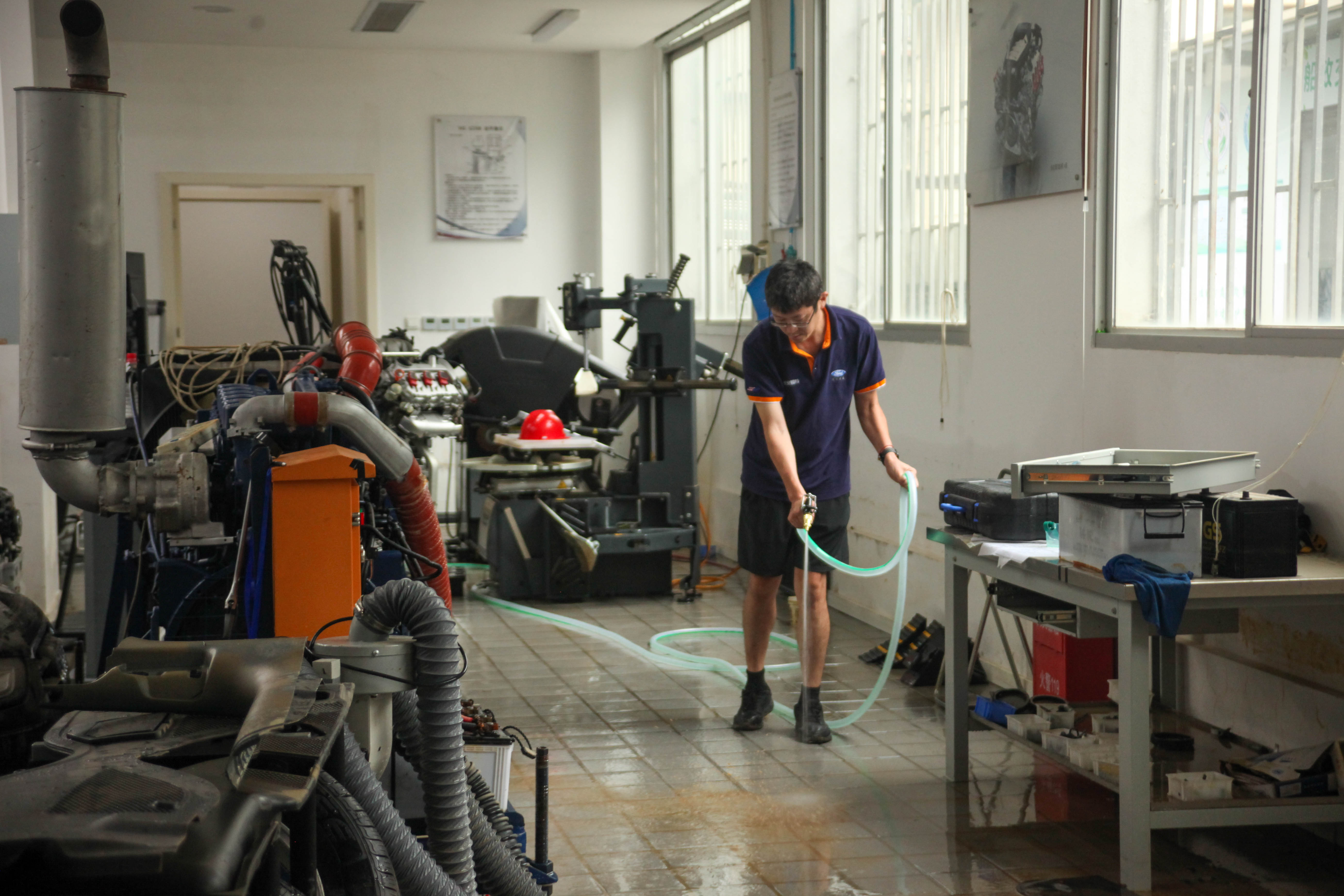 相比較于北區(qū)的校園,中區(qū)的實訓(xùn)室因地勢低下,遭遇更為嚴重的積水和淤泥堆積,清潔工作也面臨更高難度。為盡快開展實訓(xùn)室的災(zāi)后修復(fù)工作,汽車學(xué)院黨總支守土盡責,迅速組織好全體教職工,劃好責任田,明確任務(wù)分工。黨政領(lǐng)導(dǎo)班子深入到一線,老師、黨員學(xué)生、廣大青年志愿者們積極參與,大家擼起袖子干了起來……
