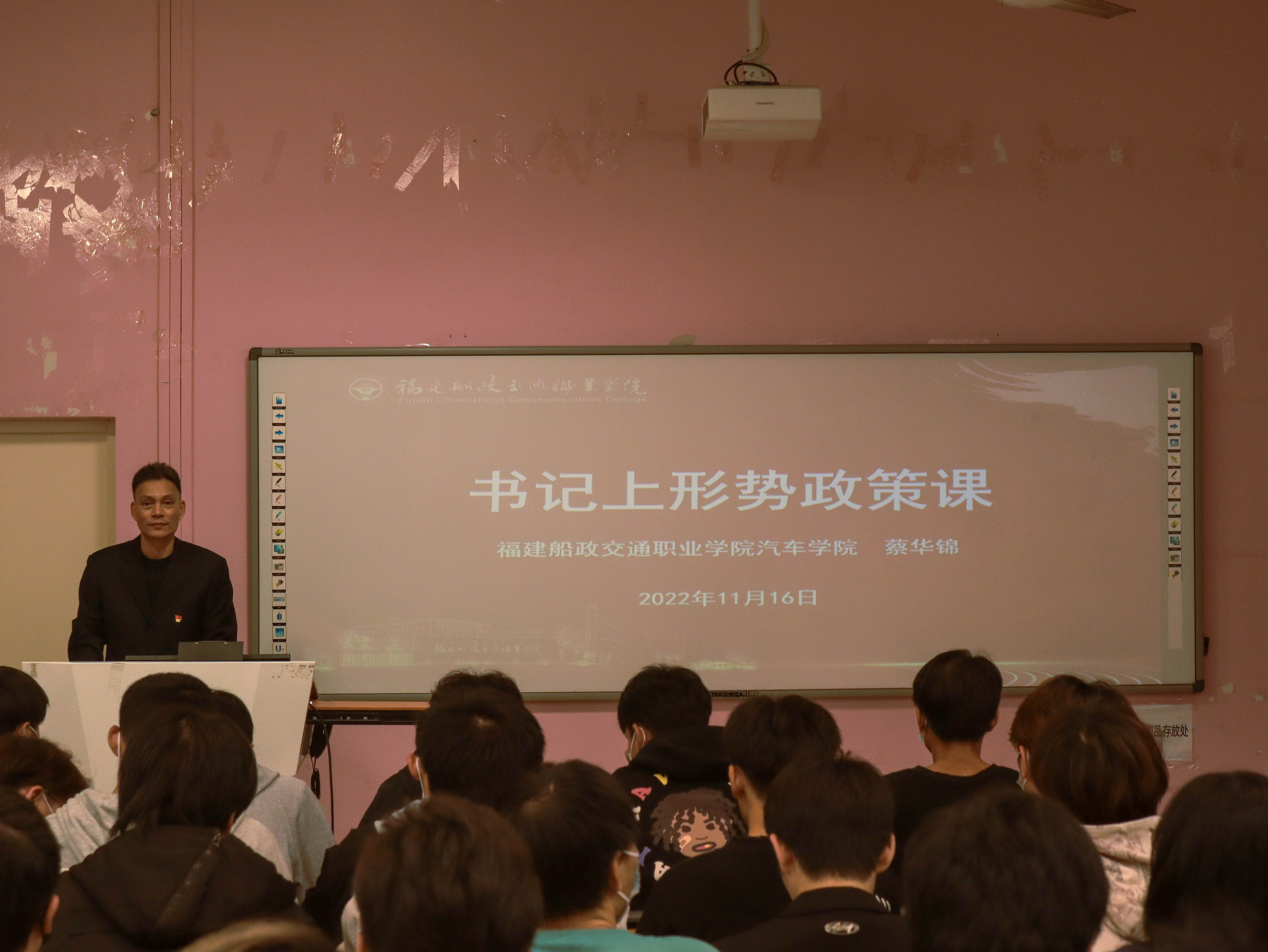 為深入學(xué)習(xí)宣傳貫徹黨的二十大精神,2022年11月16日,汽車學(xué)院黨總支書記蔡華錦以“傾聽時(shí)代脈動,展開奮斗之翼”為主題,講授學(xué)習(xí)黨的二十大精神專題“形勢與政策”課。汽車學(xué)院學(xué)生代表現(xiàn)場聆聽。