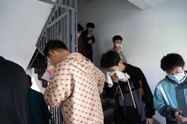 中午12:30,伴隨著警報聲長鳴,應急疏散演練正式開始,各樓棟、各樓層在班級班長和宿舍長的統(tǒng)一引導下,全體同學立刻作出響應,用濕毛巾捂住口鼻,貓著腰,迅速從安全通道進行疏散,到達指定地點后,由紀保部疏散演練小組清點人數(shù),并向陳澤承老師匯報各班級集合情況。