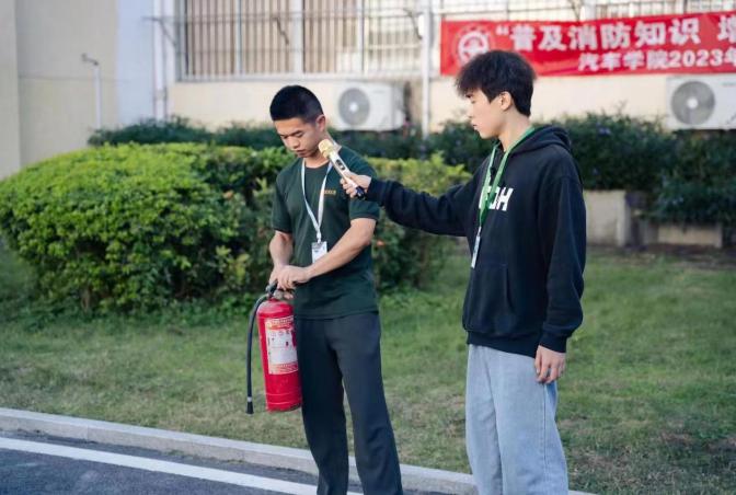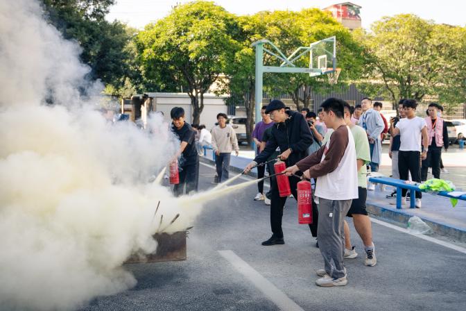 到達24號樓籃球場空曠地帶后,紀保部滅火演練小組在火坑中點燃了事先準備好的易燃物,由汽車學院自律會副主席謝智弘向廣大同學進行滅火器基本知識普及,并現(xiàn)場演示了滅火器的使用步驟規(guī)范,隨后各班學生代表紛紛上前動手操作。