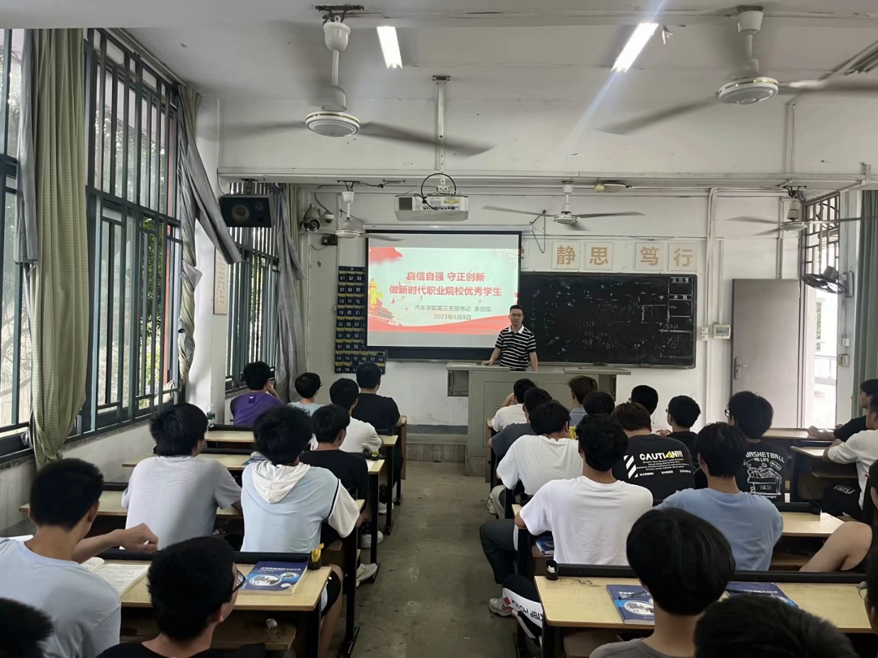 按照汽車學(xué)院黨總支關(guān)于學(xué)習(xí)貫徹習(xí)近平新時(shí)代中國(guó)特色社會(huì)主義思想主題教育工作要求和部署,2023年5月17日汽車學(xué)院第三黨支部書記朱劍寶同志在8#219教室給汽車學(xué)院學(xué)生入黨積極分子上專題黨課,主題為“自信自強(qiáng)、守正創(chuàng)新——做新時(shí)代職業(yè)院校優(yōu)秀學(xué)生”,汽車學(xué)院學(xué)生入黨積極分子參加。