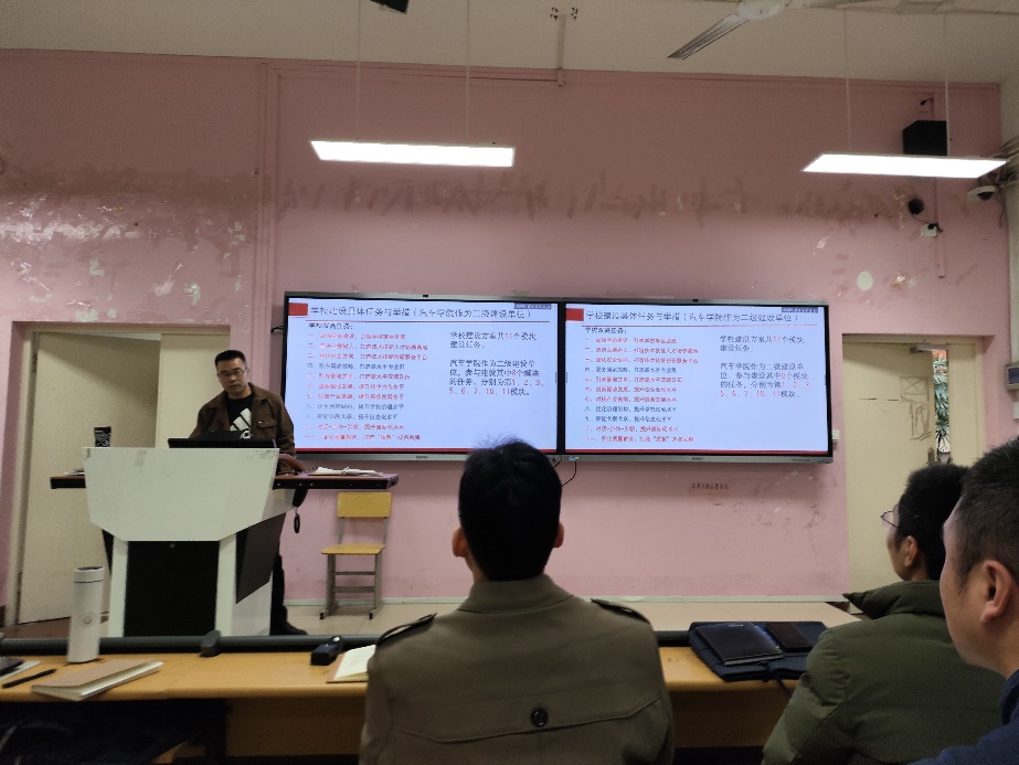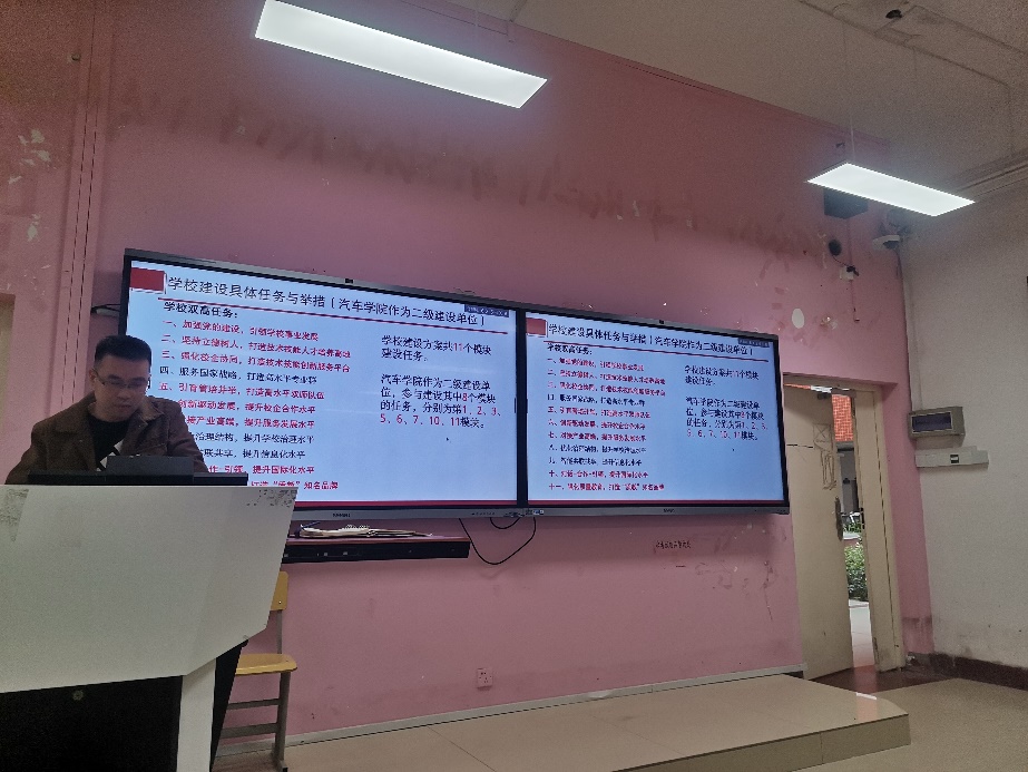 會上,朱劍寶副院長為全體教職工介紹了國家“雙高”建設(shè)計劃,從每個模塊梳理了汽車學(xué)院對“雙高”任務(wù)做出的成果,同時也肯定了大家對汽車學(xué)院做出的重大貢獻。