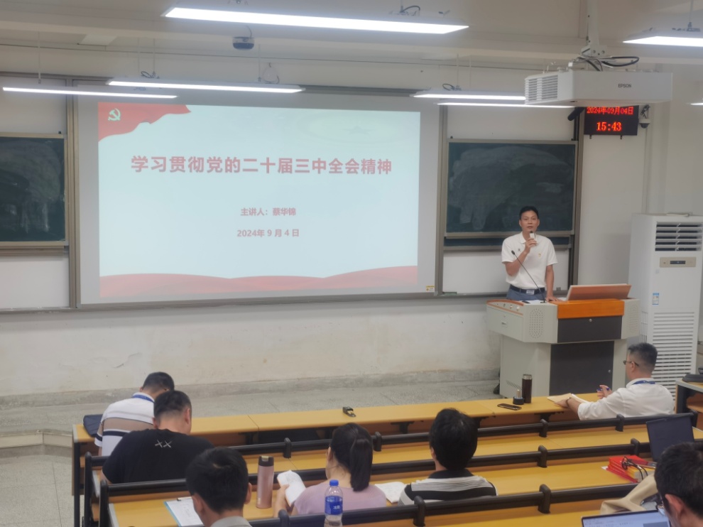 2024年9月4日,我院在22號(hào)樓汽一階梯教室開展學(xué)習(xí)貫徹黨的二十屆三中全會(huì)精神宣講報(bào)告會(huì)。學(xué)院黨總支書記蔡華錦作宣講報(bào)告,全體教職工參會(huì)。