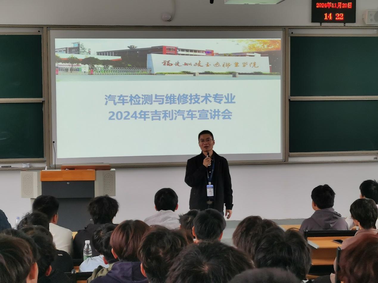 為進一步推進校企合作,提高人才培養(yǎng)質量,拓展畢業(yè)生就業(yè)渠道。2024年11月20日,汽車學院在8號樓三階教室舉行了吉利訂單班專場宣講會。吉利汽車校企合作企業(yè)代表、汽車學院院長蘇慶列、汽車檢測與維修技術專業(yè)主任曾雪蓮、吉利校企合作項目負責人呂翱、專任教師張光葳、輔導員黃見山出席本次會議,汽車學院2024級汽車檢測與維修技術專業(yè)學生等共計100余人參加此次會議。