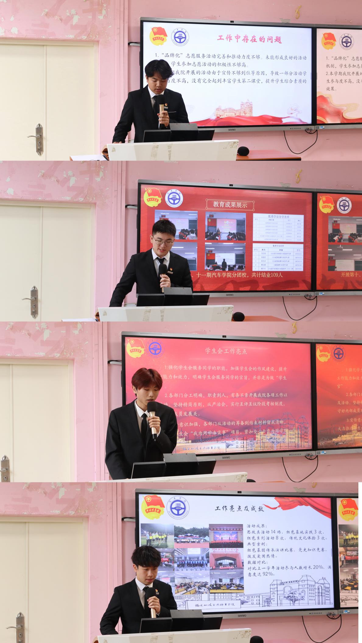 會(huì)上,汽車(chē)學(xué)院兩委的15個(gè)部門(mén)學(xué)生負(fù)責(zé)人依次上臺(tái)進(jìn)行述職,結(jié)合各部門(mén)常規(guī)工作和特色活動(dòng)以圖文并茂、數(shù)據(jù)分析等形式呈現(xiàn)本學(xué)期部門(mén)工作完成情況,同時(shí)剖析不足、復(fù)盤(pán)反思并提出合理的改進(jìn)措施,最后對(duì)部門(mén)下學(xué)期的工作進(jìn)行規(guī)劃與展望。