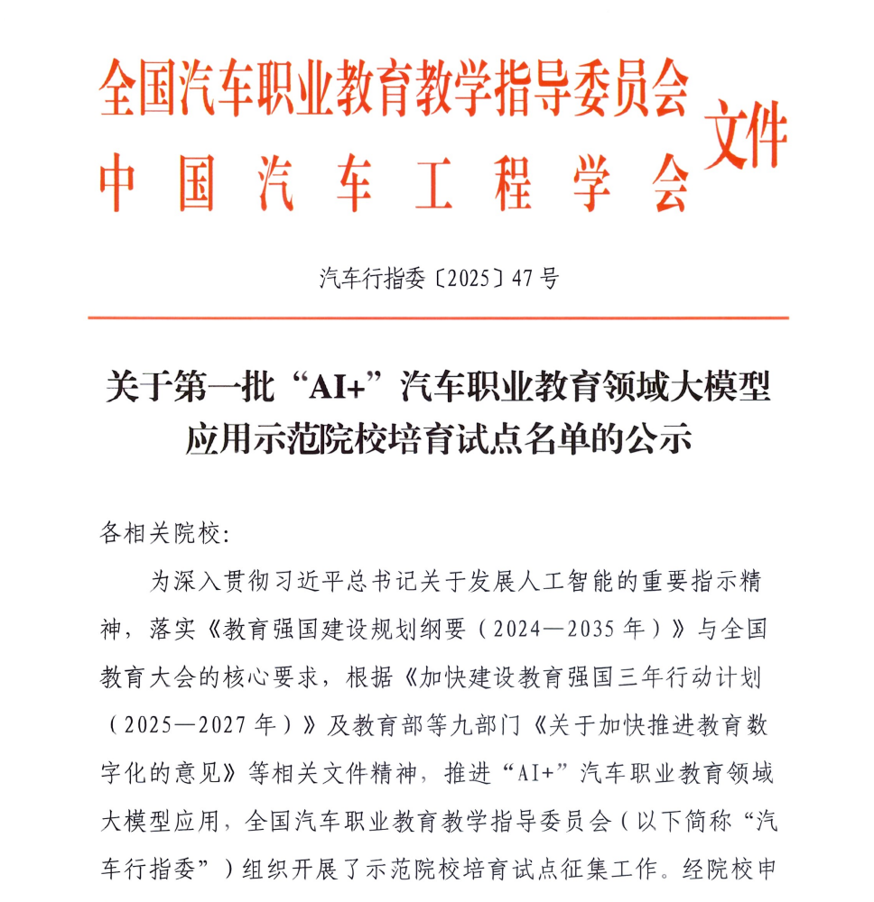 為深入貫徹落實(shí)習(xí)近平總書(shū)記關(guān)于發(fā)展人工智能的重要指示精神,落實(shí)全國(guó)教育大會(huì)精神和《教育強(qiáng)國(guó)建設(shè)規(guī)劃綱要(2024-2035年)》要求,根據(jù)《加快建設(shè)教育強(qiáng)國(guó)三年行動(dòng)計(jì)劃(2025-2027年)》及教育部等九部門(mén)《關(guān)于加快推進(jìn)教育數(shù)字化的意見(jiàn)》等文件精神,在人工智能技術(shù)全面賦能職業(yè)教育發(fā)展的新階段,我院積極推進(jìn)人工智能技術(shù)深度賦能職業(yè)教育,近期成功獲批兩項(xiàng)全國(guó)汽車(chē)行指委第一批“‘AI+’汽車(chē)職業(yè)教育大模型應(yīng)用示范院校培育試點(diǎn)”和“人工智能+汽車(chē)通識(shí)教育試點(diǎn)院?!?。