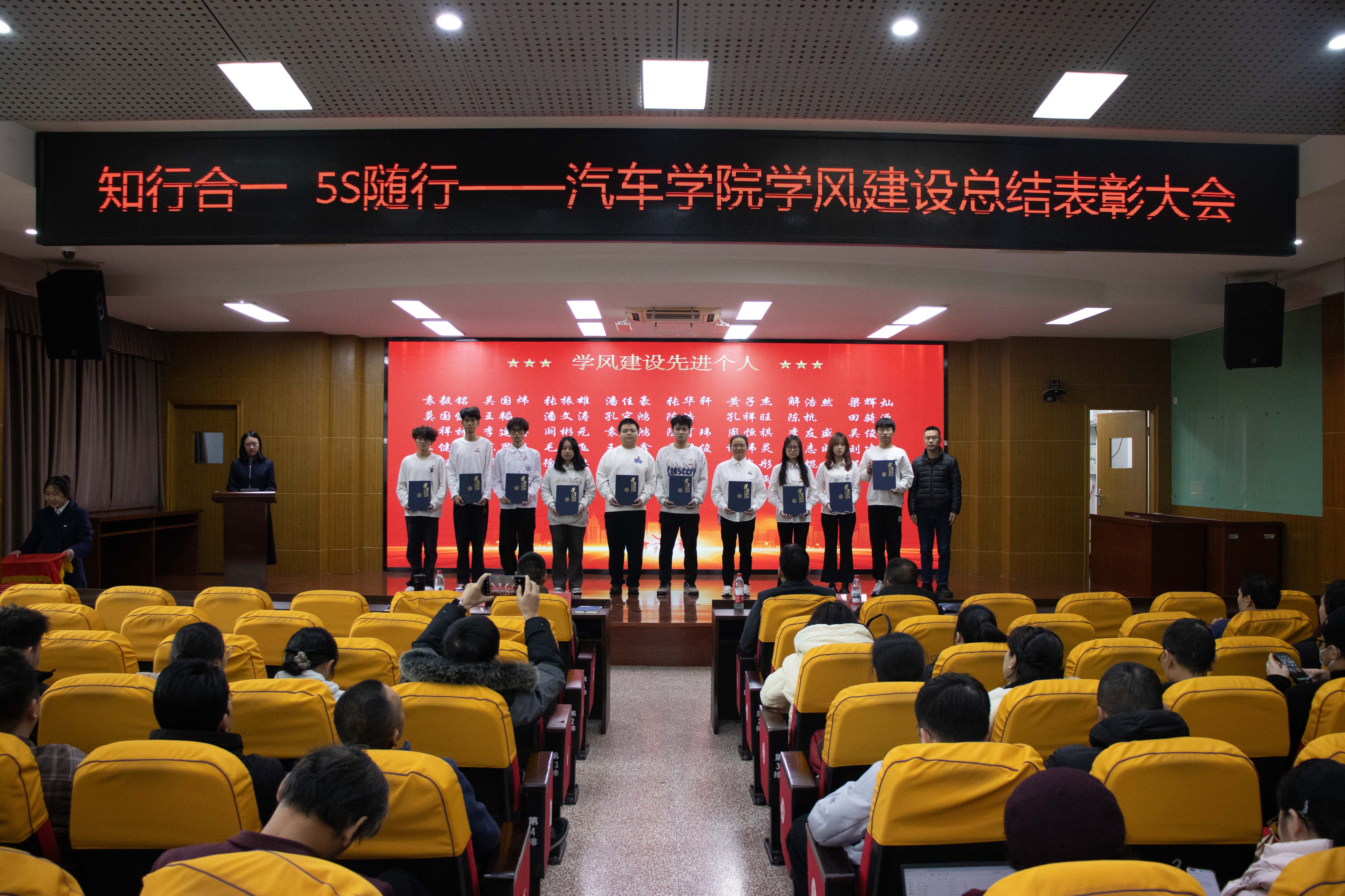為進一步加強學風建設(shè),表彰先進、樹立典型,汽車學院于1月21日在北區(qū)一號行政樓6樓學術(shù)報告廳開展“知行合一、5S隨行”——汽車學院學風建設(shè)總結(jié)表彰大會。學院領(lǐng)導班子、全體教師、輔導員及各班級學生代表參加此次大會。大會由分團委書記余晨煒主持。