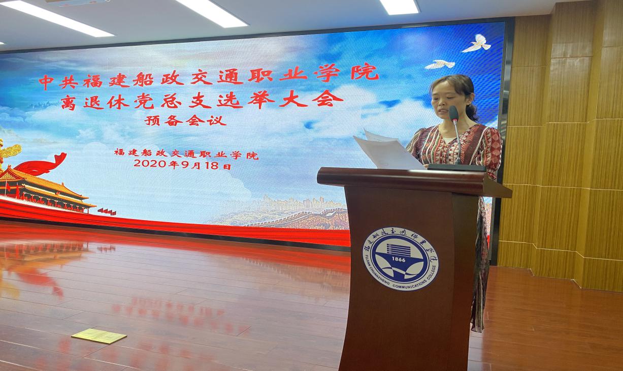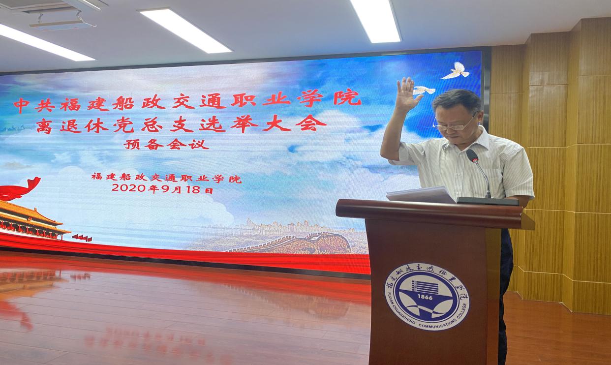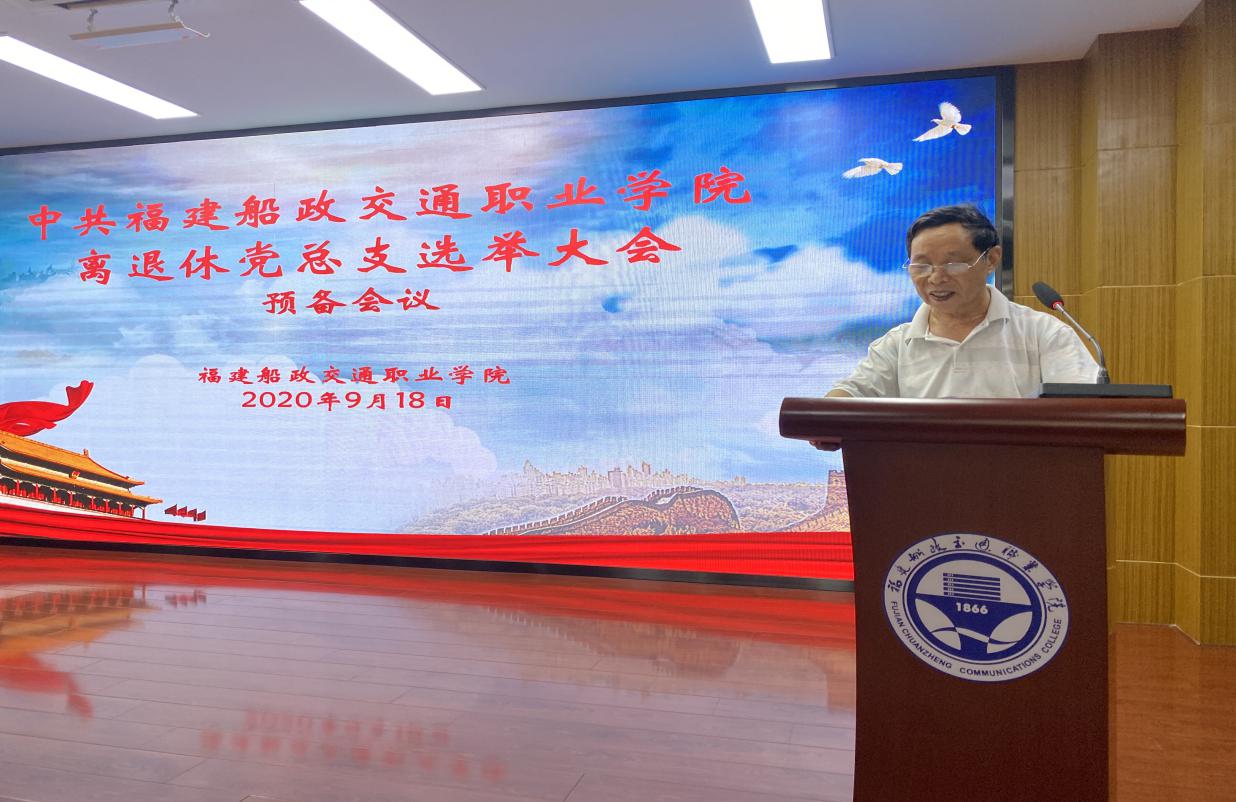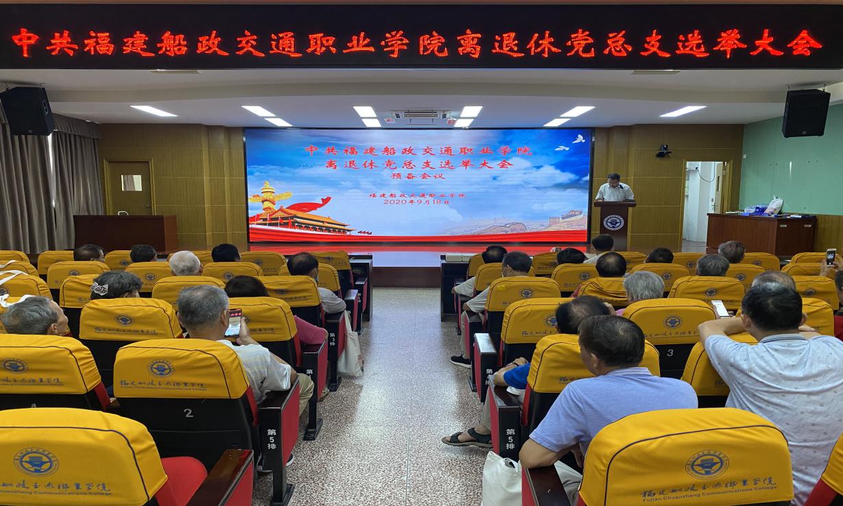 2020年9月18日上午,福建船政交通職業(yè)學(xué)院離退休黨總支成立大會在一號樓六樓學(xué)術(shù)報告廳舉行。大會由退休黨員王向民同志主持,50余名離退休黨員參加成立大會。