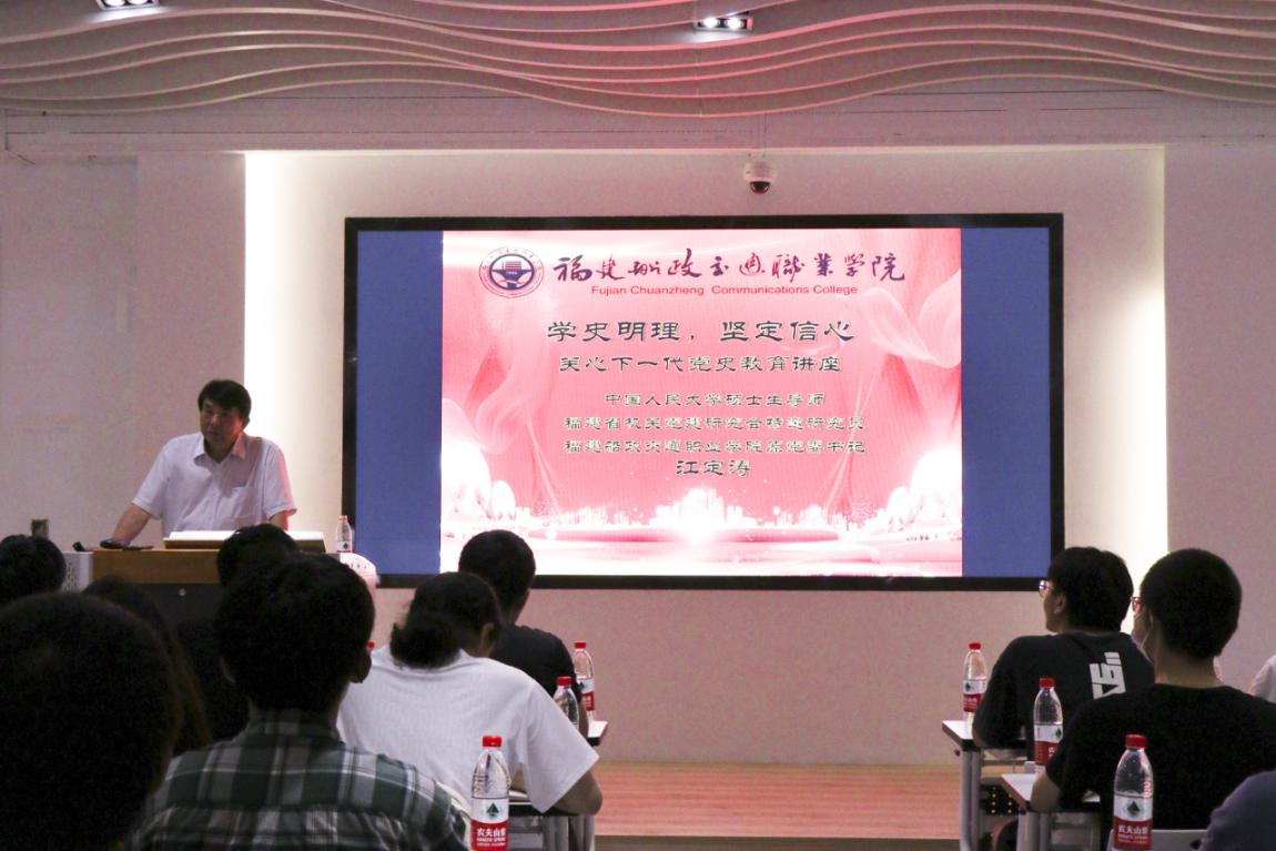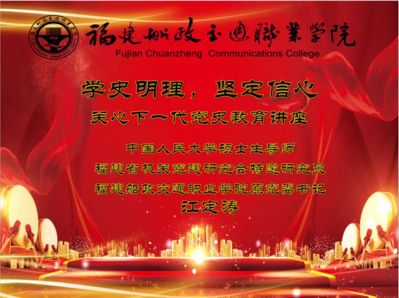 以史為鑒,開創(chuàng)未來。為推動黨史學(xué)習(xí)教育常態(tài)化長效化開展,以實際行動迎接黨的二十大勝利召開,2022年5月31日下午,學(xué)院關(guān)工委邀請“五老”代表、中國人民大學(xué)碩士生導(dǎo)師、福建省機關(guān)黨建研究會特邀研究員、福建船政交通職業(yè)學(xué)院原黨委書記江定濤做《學(xué)史明理 堅定信心》黨史學(xué)習(xí)教育專題講座。馬克思主義學(xué)院教師代表、習(xí)近平新時代中國特色社會主義思想讀書社、船政青年求是社、辯論協(xié)會、法學(xué)社等師生百余人參加講座。