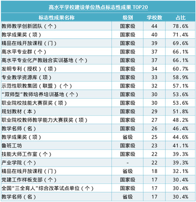 從統(tǒng)計數(shù)據(jù)來看,國家級教師教學(xué)創(chuàng)新團隊成為“雙高計劃”56所高水平學(xué)校建設(shè)單位標志性成果最熱詞匯,44所院校(78.6%)均將建設(shè)國家級教師教學(xué)創(chuàng)新團隊列為標志性成果;其次是國家教學(xué)成果獎、國家精品在線開放課程、國家高水平專業(yè)群、國家高水平專業(yè)化產(chǎn)教融合實訓(xùn)基地,分列第2至第5位,超過60%的院校標志性成果中涵蓋了這些指標。