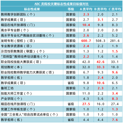 ABC三類院校關(guān)鍵標志性成果目標設(shè)置對比: