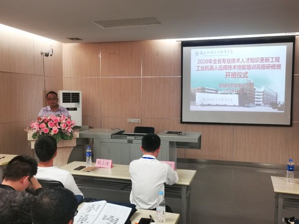楊開懷院長首先對參加開班儀式的領(lǐng)導(dǎo)和嘉賓表示歡迎,對給予此次培訓(xùn)技術(shù)支持的福建閩大科技有限公司表示感謝。接著介紹了機械與智能制造學(xué)院工業(yè)機器人專業(yè)的歷史沿革,以及工業(yè)機器人應(yīng)用技術(shù)領(lǐng)域近年來的發(fā)展前景,我院在工業(yè)機器人專業(yè)課程優(yōu)化、實驗室建設(shè)、技能競賽等方面取得的優(yōu)異成績,并努力致力于為我省乃至全國的工業(yè)機器人行業(yè)培養(yǎng)高素質(zhì)技能人才。