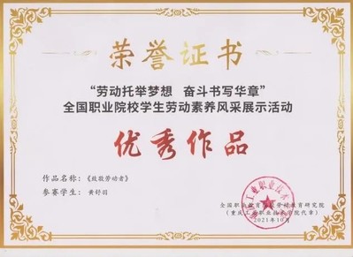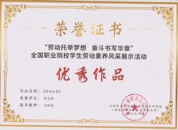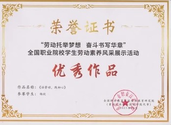 根據(jù)全國職業(yè)院校勞動教育研究院主辦的第一屆全國職業(yè)院校學(xué)生勞動素養(yǎng)風(fēng)采展示活動通知要求,我院積極響應(yīng),在全院范圍進行了廣泛的宣傳,組織開展了以“勞動最美麗奮斗最幸?!睘橹黝}的系列教育活動,動員學(xué)生踴躍參與活動。學(xué)院對評審后的優(yōu)秀作品上報至全國職業(yè)院校勞動教育研究院進行參評。4個作品獲獎,參賽作品充分表現(xiàn)了我院學(xué)子的勤儉、奮斗、創(chuàng)新、奉獻的勞動精神。