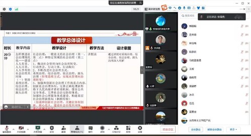 主題是加強(qiáng)民生為重點(diǎn)的社會(huì)建設(shè),主講人張瑞青,藍(lán)香清、陸李欽進(jìn)行片段教學(xué),全體教研室教師參與集備。張瑞青老師從教學(xué)重點(diǎn)、教學(xué)難點(diǎn)、學(xué)情分析、教學(xué)建議、教學(xué)總體設(shè)計(jì)等幾個(gè)方面進(jìn)行分享,并就如何安排授課結(jié)構(gòu)體系,設(shè)置授課問題鏈,以及課堂互動(dòng)等方面進(jìn)行了充分的討論和科學(xué)的設(shè)置,對(duì)完善優(yōu)化豐富該專題結(jié)構(gòu)及內(nèi)容發(fā)揮了巨大作用。