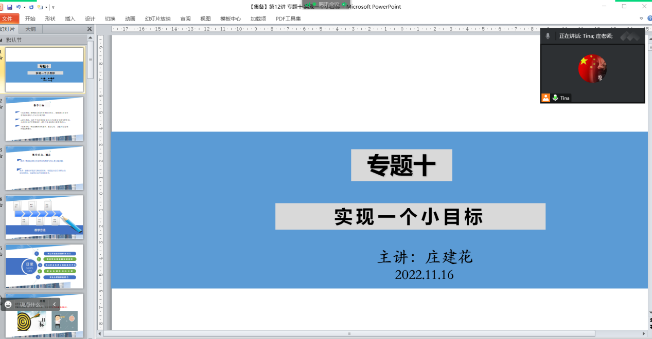 此次備課的主要內容是專題十“實現(xiàn)一個小目標“。首先,由莊建花老師為主講。莊老師結合自身教學經驗和當前線上教學實際,同大家詳細地分享了本專題的教學設計、教學策略和授課技巧。
