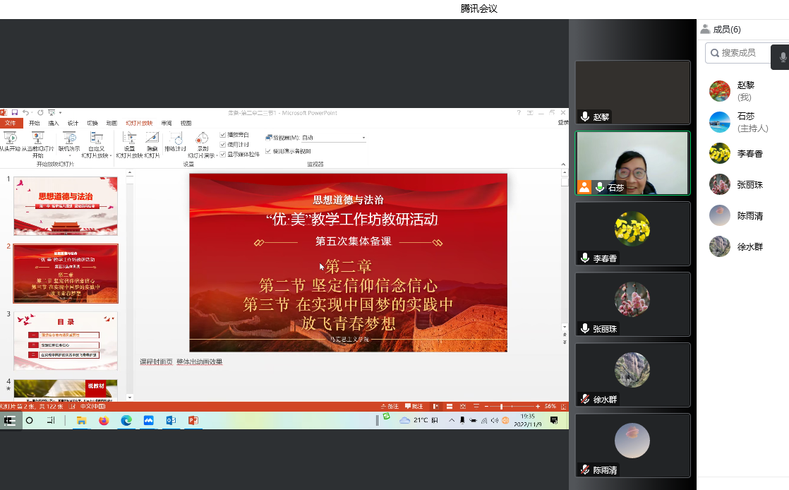 為進(jìn)一步提升教學(xué)質(zhì)量,推進(jìn)思政課課程建設(shè),馬克思主義學(xué)院思想道德與法治教研室于11月9日晚在線上進(jìn)行了本學(xué)期的第5次集體備課。