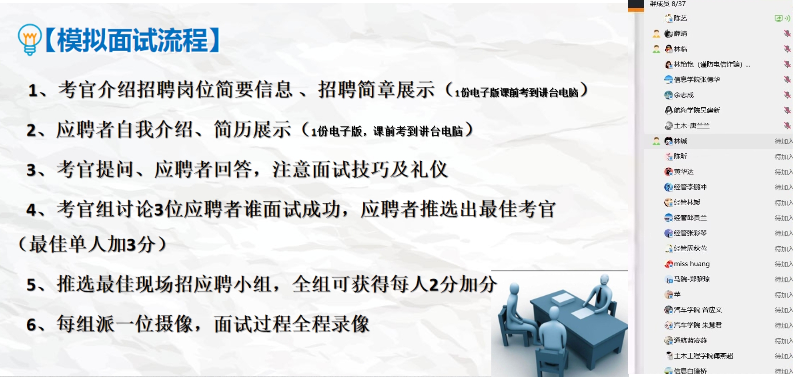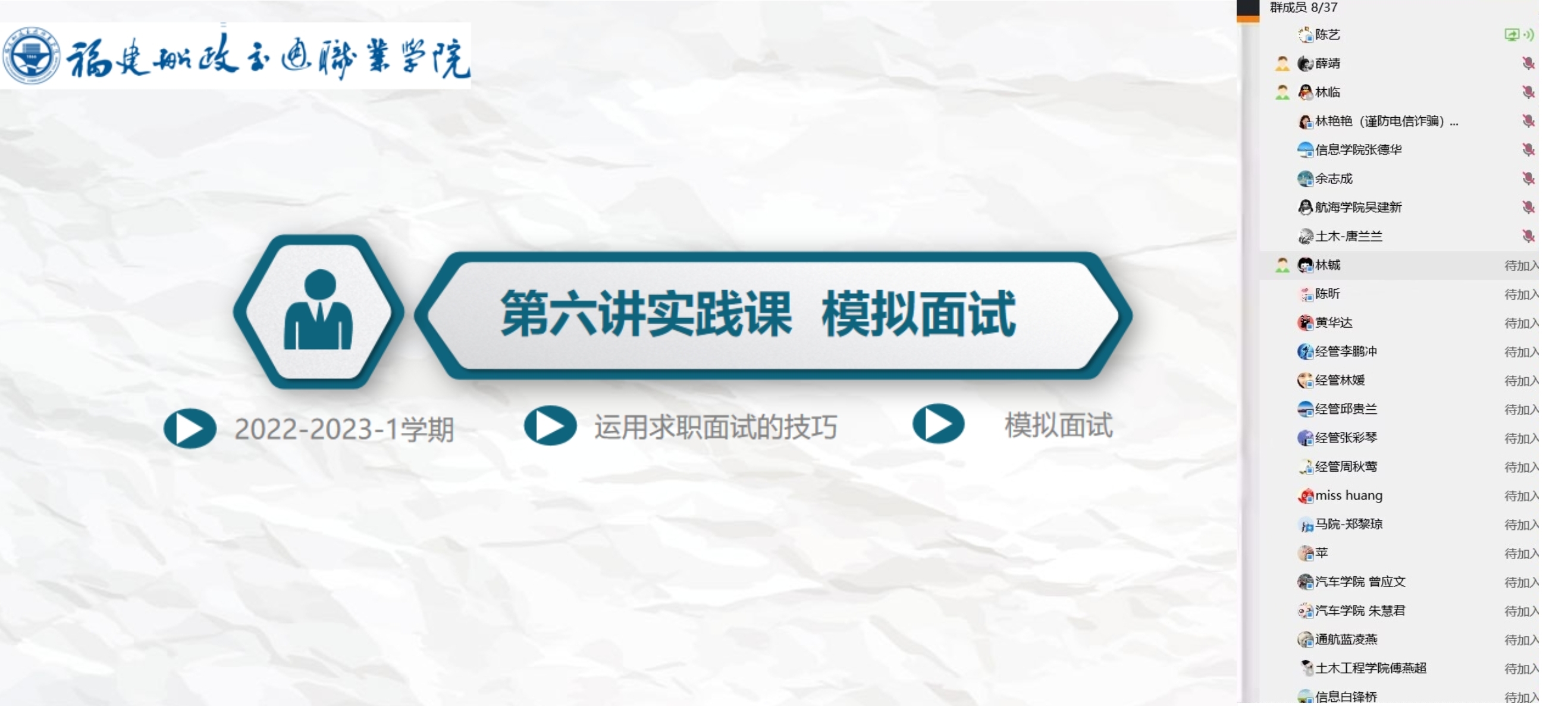 8月13日,馬克思主義學(xué)院就業(yè)與創(chuàng)業(yè)教研室按計(jì)劃舉辦了本學(xué)期第六次線上集體備課活動(dòng)。本次活動(dòng)由就業(yè)與創(chuàng)業(yè)教研室主任薛靖老師主持,由老師陳藝主講,其他講授本課的專兼職教師共同參與,本次備課主題為“第六講 求職技巧 實(shí)踐課--模擬面試”。