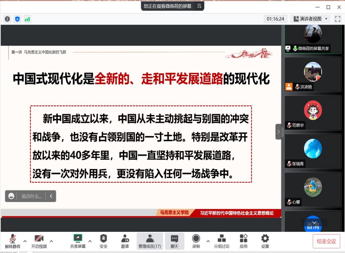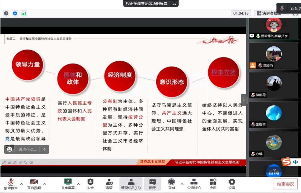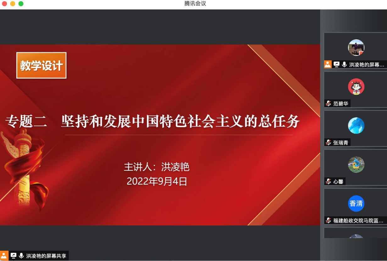 2022年9月4日,馬克思主義學(xué)院“習(xí)近平新時代中國特色社會主義思想概論”教研室全體專兼職教師在騰訊會議開展了“優(yōu)·美”教學(xué)工作坊教研活動。本次教研的內(nèi)容是本課程的“專題二 堅持和發(fā)展中國特色社會主義的總?cè)蝿?wù)”,由洪凌艷老師擔(dān)任主備課人。