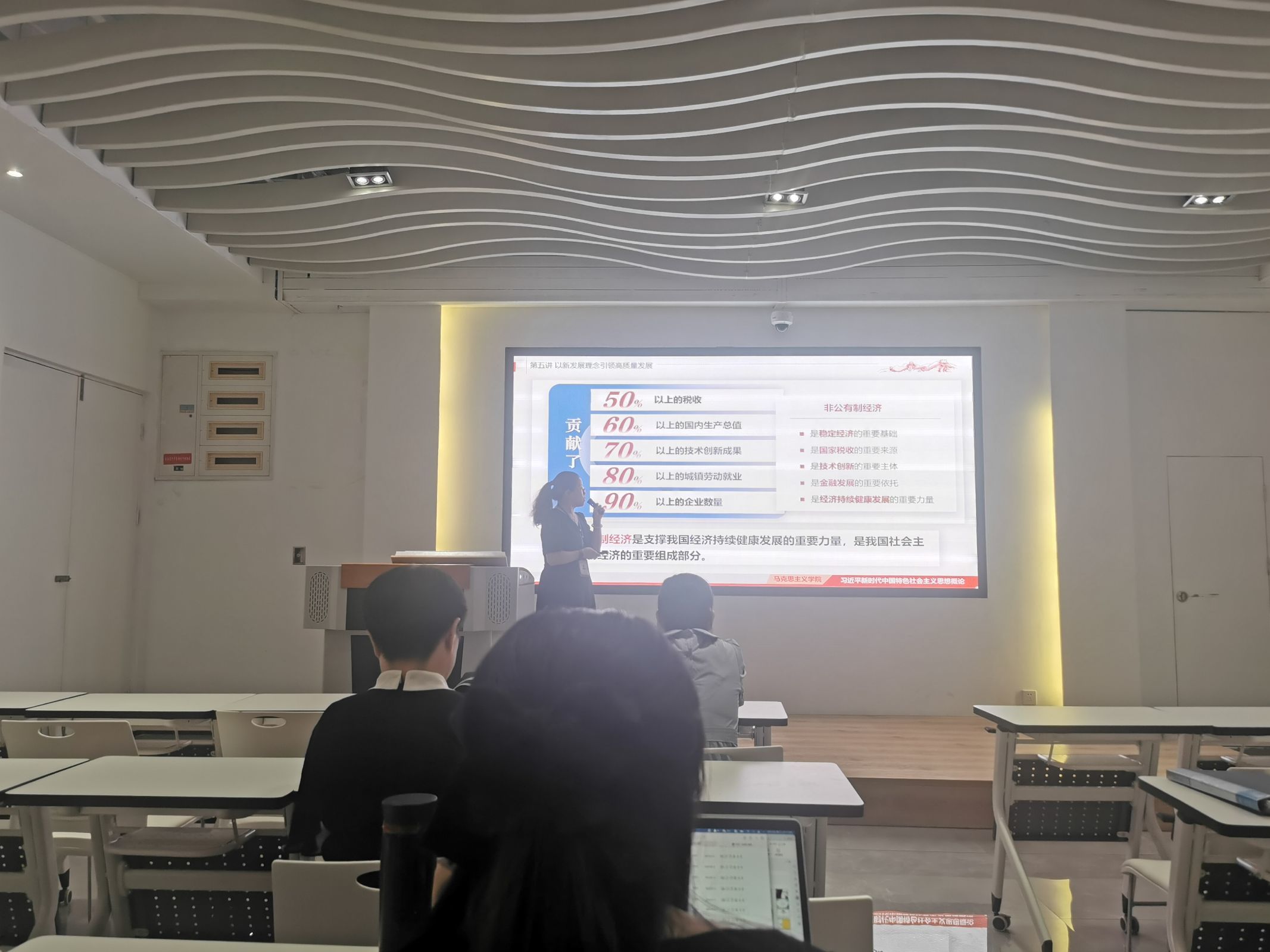 隨后劉麗萍老師就“非公有制經(jīng)濟(jì)在國民經(jīng)濟(jì)和社會發(fā)展中的地位和作用”進(jìn)行了教學(xué)片段展示。劉麗萍老師首先引用習(xí)近平總書記在主持召開民營企業(yè)座談會的講話“民營企業(yè)和民營企業(yè)家是我們自己人”,引發(fā)關(guān)于“民營經(jīng)濟(jì)在國民經(jīng)濟(jì)和社會發(fā)展中的作用體現(xiàn)在哪里?”的思考。結(jié)合數(shù)字“5、6、7、8、9”引出非公有制經(jīng)濟(jì)的重要貢獻(xiàn)。同時結(jié)合晉江經(jīng)驗的案例,再次明確要毫不動搖鼓勵、支持、引導(dǎo)非公有制經(jīng)濟(jì)發(fā)展。