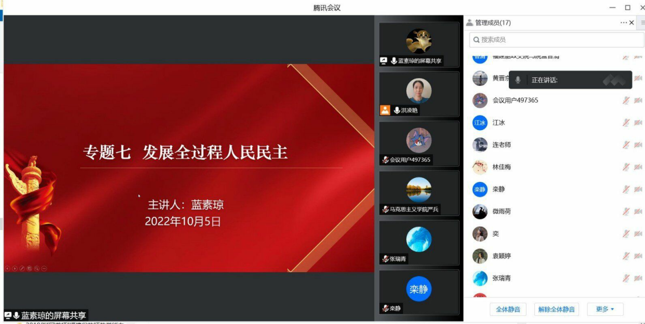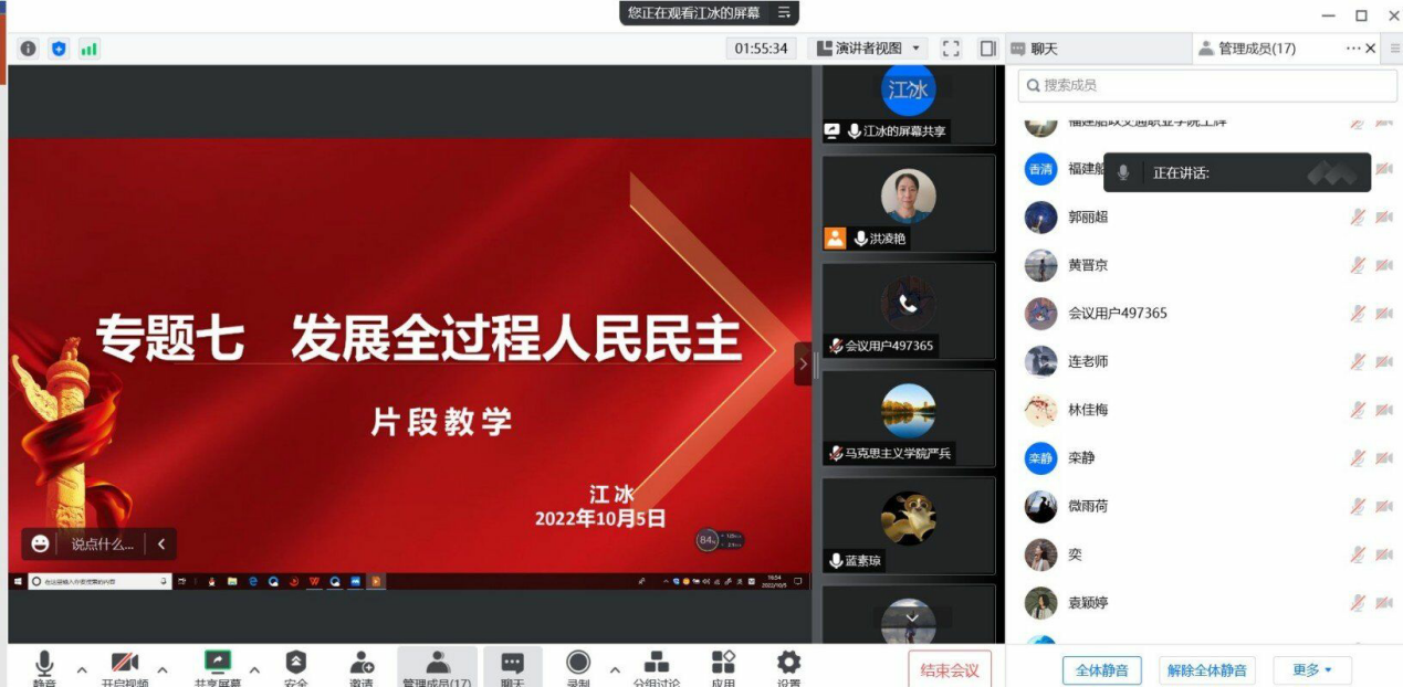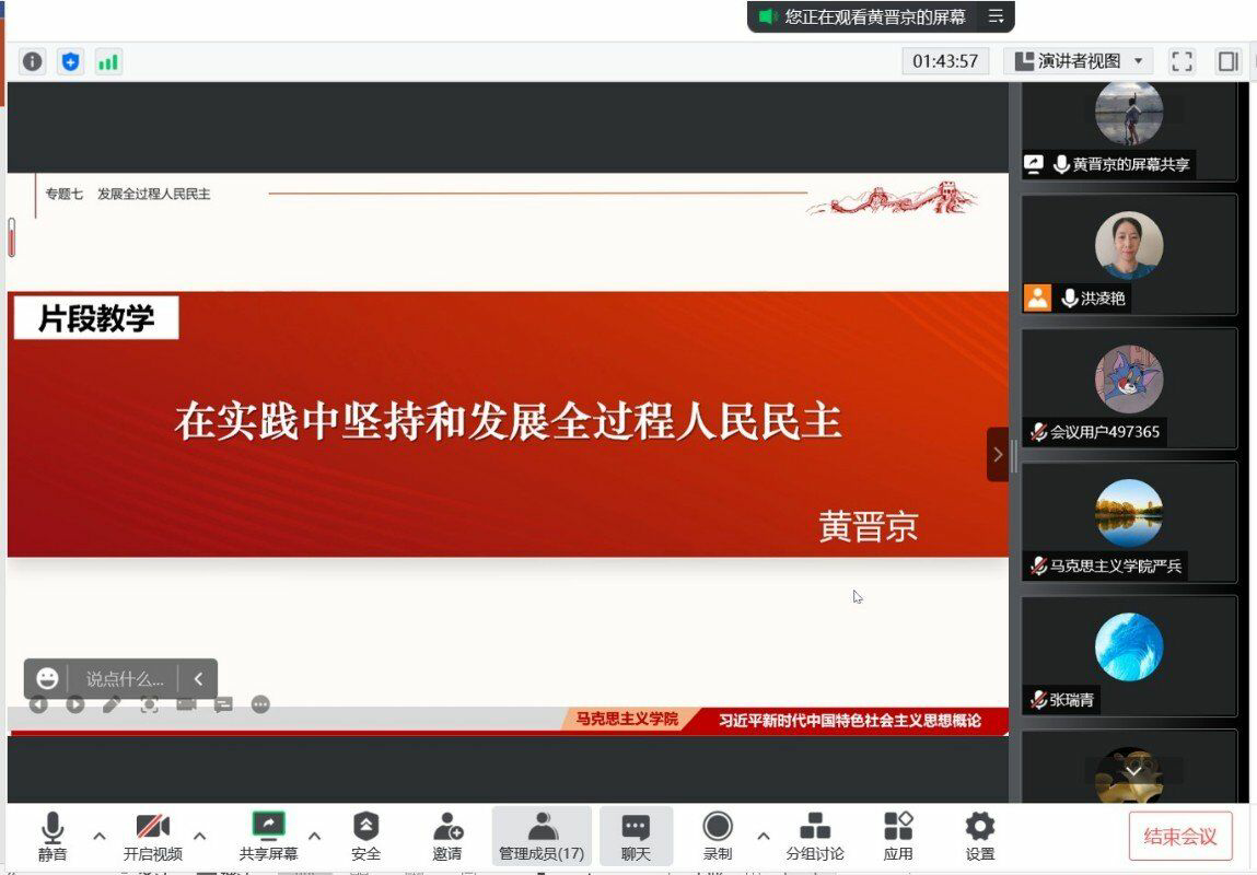2022年10月5日馬克思主義學(xué)院習(xí)近平新時(shí)代中國(guó)特色社會(huì)主義思想概論教研室舉行了本學(xué)期第七次集體備課會(huì),由于疫情影響,本次備課會(huì)在線上進(jìn)行。由教研室主任洪凌艷老師主持,藍(lán)素瓊老師就第七專題“全過程人民民主”進(jìn)行主講,江冰老師和黃晉京老師進(jìn)行片段教學(xué)展示,全體專兼職任課教師參加了會(huì)議。會(huì)議分為兩個(gè)階段。
