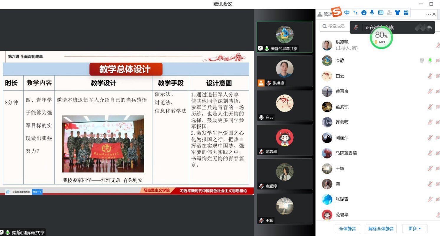 近日,我院“習(xí)近平新時(shí)代中國(guó)特色社會(huì)主義思想概論”教研室全體專兼職教師在線上開展了“優(yōu)·美”教學(xué)工作坊教研活動(dòng)。