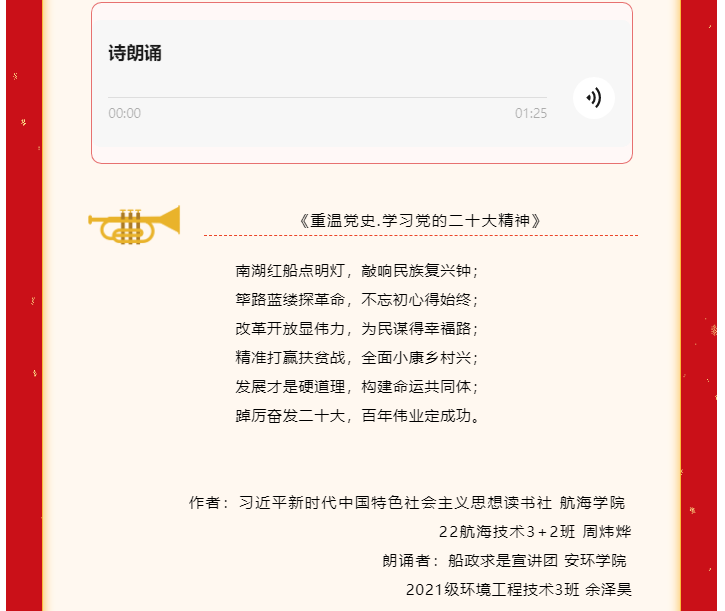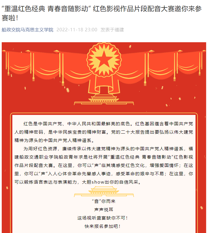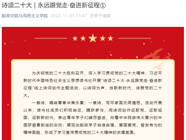 為進一步落實好黨的二十大精神進頭腦,馬克思主義學(xué)院用好第一課堂和第二課堂,以形式豐富的活動方式激發(fā)青年大學(xué)生的學(xué)習(xí)熱情。習(xí)近平新時代中國特色社會主義思想教研室在全校開展“黨的二十大知識競賽”,組織學(xué)生制作學(xué)習(xí)筆記、金句書法等作品;指導(dǎo)讀書社學(xué)生開展“詩頌黨的二十大·永遠跟黨走·奮進新征程”線上詩詞創(chuàng)作主題活動,以詩詞為聲,放歌新時代,詩贊黨的二十大;船政青年求是社開展“重溫紅色經(jīng)典,青春音隨影動”主題紅色影視作品片段配音大賽,弘揚偉大建黨精神;集體備課,成立黨的二十大精神師生宣講報告團。通過這一系列舉措力求對黨的二十大精神學(xué)深學(xué)透、融會貫通,最終把學(xué)習(xí)、實踐成果轉(zhuǎn)化為推進學(xué)校高質(zhì)量發(fā)展的不竭動力。