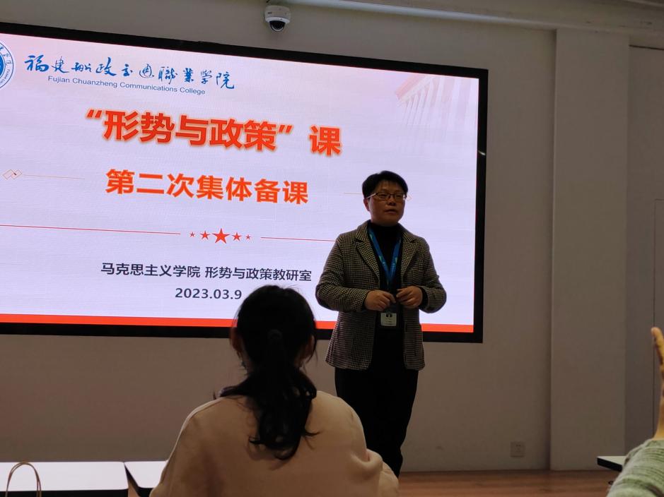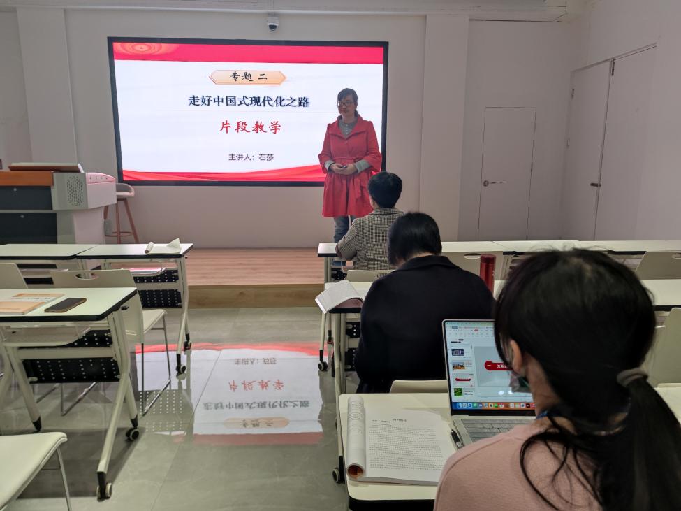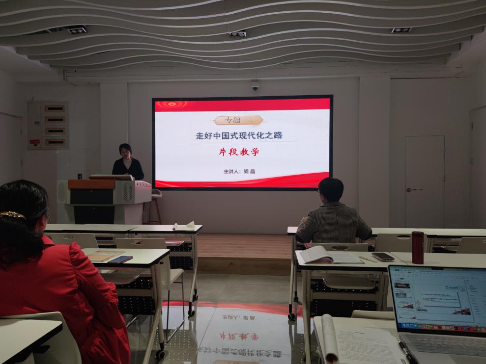 2023年3月9日,馬克思主義學(xué)院“形勢與政策”教研室在黨建館開展了本學(xué)期“優(yōu)·美”教學(xué)工作坊第二次教研活動。本次教研活動圍繞“形勢與政策”課專題二“走好中國式現(xiàn)代化之路”展開,由嚴(yán)兵老師主講,石莎和梁晶老師進(jìn)行無生片段教學(xué),全體任課教師參加了教研活動。