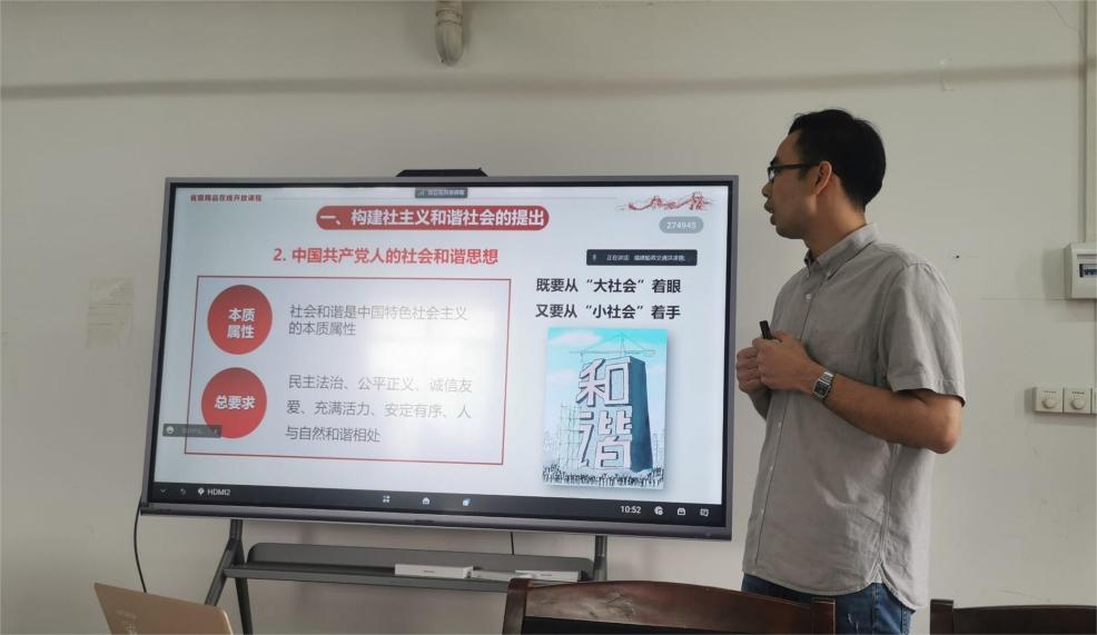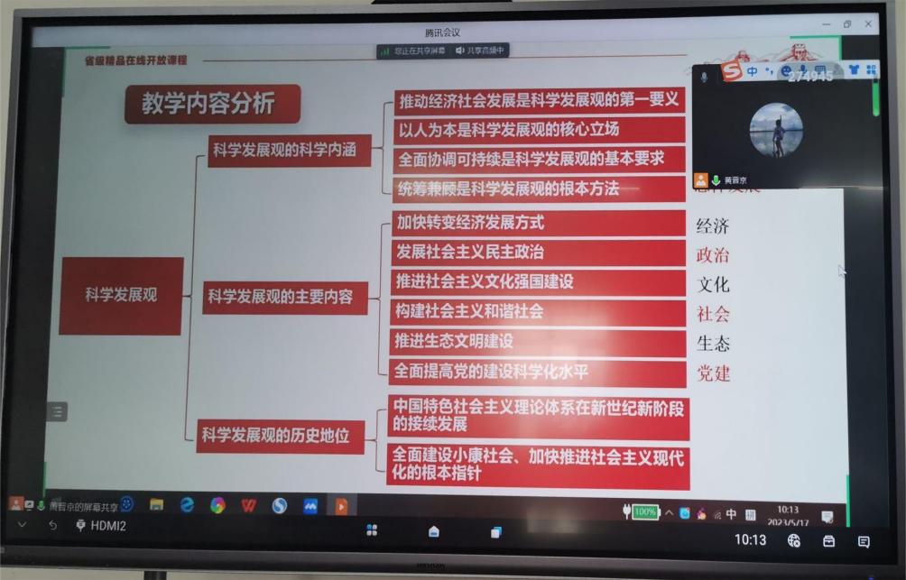 2023年5月17日,馬克思主義學院“毛澤東思想和中國特色社會主義理論體系概論”教研室全體專兼職教師在圖書館11樓1101室開展了“優(yōu)·美”教學工作坊教研活動。本次教研活動圍繞概論第八章“科學發(fā)展觀”展開教學研討活動,由黃晉京老師擔任主備課人。