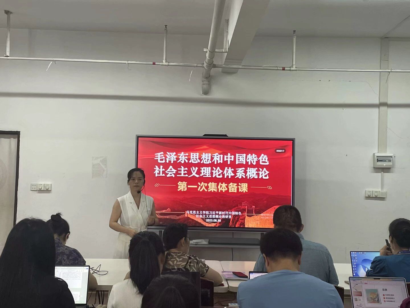 2023年8月30日,馬克思主義學(xué)院“毛澤東思想和中國(guó)特色社會(huì)主義理論體系概論”教研室全體專兼職教師在圖書(shū)館11樓1101室開(kāi)展了“優(yōu)·美”教學(xué)工作坊教研活動(dòng)。本次教研的內(nèi)容是本課程的“導(dǎo)言 馬克思主義中國(guó)化時(shí)代化的歷史進(jìn)程與理論成果”,由江冰老師擔(dān)任主備課人。