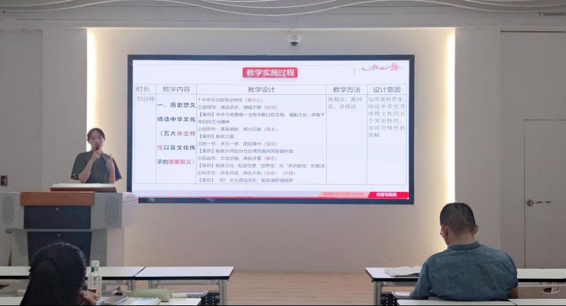 陳雨清老師就歷史悠久締造中華文化、培根鑄魂推動文化繁榮、篤定前行建設(shè)現(xiàn)代文明三個方面,深刻闡述了在新的起點上繼續(xù)推動文化繁榮、建設(shè)文化強國、建設(shè)中華民族現(xiàn)代文明的新時代文化使命。對本專題的邏輯結(jié)構(gòu)和教學(xué)設(shè)計做了詳細(xì)的分享和介紹。結(jié)合船政文化貫穿中華傳統(tǒng)文化的五個特性,引用《逃出大英博物館》、“村超”等當(dāng)前社會熱點文化大事件作為教學(xué)案例,分享授課創(chuàng)意,極大的豐富了該主題的備課內(nèi)容。