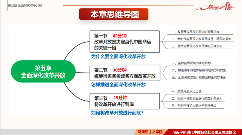 黃晉京老師主要圍繞“改革開放是決定當(dāng)代中國命運的關(guān)鍵一招”、“統(tǒng)籌推進各領(lǐng)域各方面改革開放”、和“將改革開放進行到底”三個部分展開說課。尤其針對改革開放是我們前進的重要法寶、新時代全面深化改革開放是一場深刻革命、堅持全面深化改革開放的正確方向和堅持全面深化改革總目標(biāo)等內(nèi)容進行詳細闡釋,并結(jié)合教材和自身的教學(xué)實踐與豐富經(jīng)驗,從整體層面闡述了第五章的教學(xué)重點、難點以及對本門課程實踐教學(xué)的具體內(nèi)容及整體推進過程提出了相關(guān)要求。