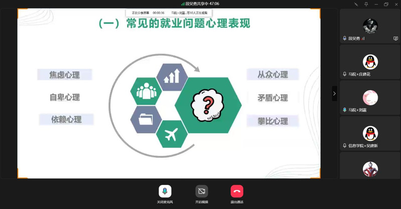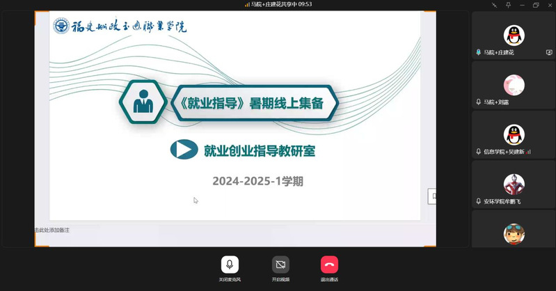 為進一步推進《就業(yè)指導(dǎo)》課程的規(guī)范化和專業(yè)化建設(shè),提升就業(yè)指導(dǎo)課程教學(xué)質(zhì)量,做好畢業(yè)班就業(yè)指導(dǎo)工作,促進畢業(yè)生更加充分更高質(zhì)量就業(yè)。近日,馬克思主義學(xué)院就業(yè)指導(dǎo)教研室開展2024-2025-1學(xué)期《就業(yè)指導(dǎo)》暑期課程線上集體備課教研活動。此次活動由教研主任薛靖老師主持,全體專兼職任課教師參加。