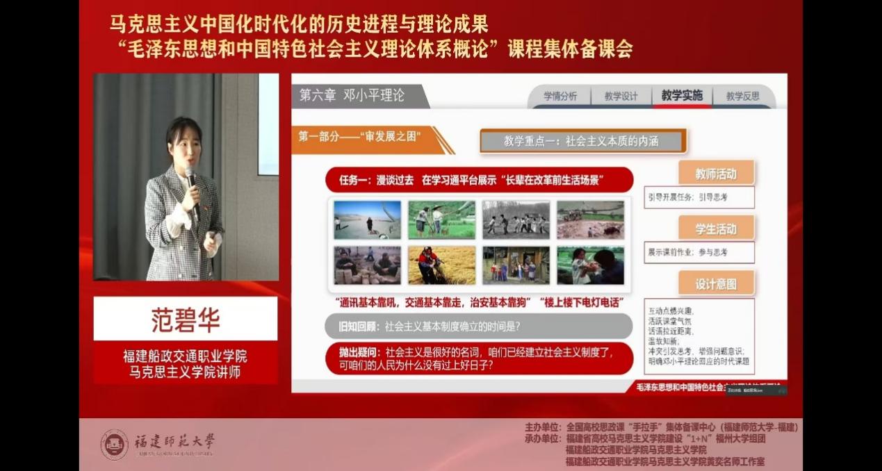 本次集備會(huì)由全國(guó)高校思政課“手拉手”集體備課中心(福建師范大學(xué)—福建?。┲鬓k,福建省高校馬克思主義學(xué)院建設(shè)“1+N”福州大學(xué)組團(tuán)、福建船政交通職業(yè)學(xué)院馬克思主義學(xué)院、福建船政交通職業(yè)學(xué)院馬克思主義學(xué)院黃奕名師工作室承辦。概論教研室教師范碧華在本次集體備課會(huì)中進(jìn)行說(shuō)課展示,其他教師在線下共同觀摩學(xué)習(xí)。