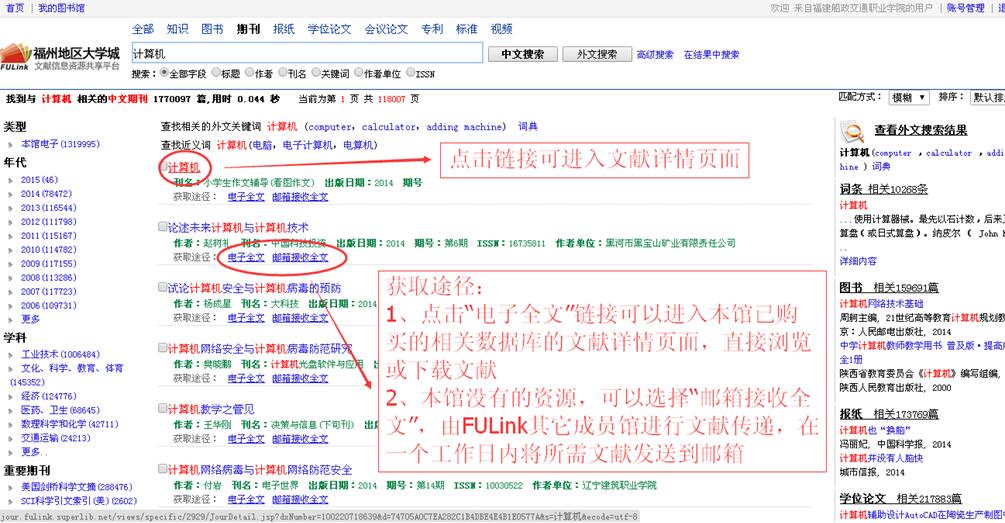 FULink平臺(tái)是在福建省教育廳組織領(lǐng)導(dǎo)下,由福州大學(xué)城八所高校和廈門(mén)大學(xué)共同參與建設(shè)的,以文獻(xiàn)信息的聯(lián)合保障體系建設(shè)和資源共享為主要任務(wù),整合各高校圖書(shū)館資源、發(fā)揮聯(lián)合優(yōu)勢(shì),為大學(xué)城共享區(qū)域內(nèi)的廣大師生提供校際間的文獻(xiàn)傳遞、聯(lián)合借閱等高水平便捷的信息資源“一站式”服務(wù)。我校于今年初正式加入FULink平臺(tái),借助FuLink平臺(tái),可以共享福州地區(qū)大學(xué)城的文獻(xiàn)資源,實(shí)現(xiàn)在同一平臺(tái)上進(jìn)行圖書(shū)、期刊、報(bào)紙、學(xué)術(shù)論文、會(huì)議論文、標(biāo)準(zhǔn)、專(zhuān)利、視頻等內(nèi)容的“一站式”統(tǒng)一檢索。讀者只需通過(guò)簡(jiǎn)單的操作,就可以掌握平臺(tái)的基本使用技巧。