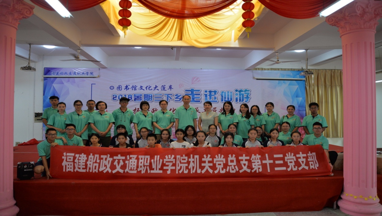 為深入學(xué)習(xí)宣傳貫徹習(xí)近平新時代中國特色社會主義思想和黨的十九大精神,圍繞助力鄉(xiāng)村振興戰(zhàn)略和精準(zhǔn)脫貧,引導(dǎo)我院青年學(xué)生貢獻(xiàn)青春智慧和力量,積極投身社會實踐。2018年暑期,機(jī)關(guān)黨總支第十三黨支部帶領(lǐng)圖書館思源志愿服務(wù)隊共計25名師生依托 “文化大篷車”項目,組成了圖書館暑期三下鄉(xiāng)“教育關(guān)愛服務(wù)隊”,帶著我院師生的愛心,通過以“弘揚船政文化 傳承工匠精神”為主旨的一系列服務(wù)活動,在仙游開展了為期一周的暑期社會實踐活動,將滿滿的愛意傳遞到仙游縣市民的心中。