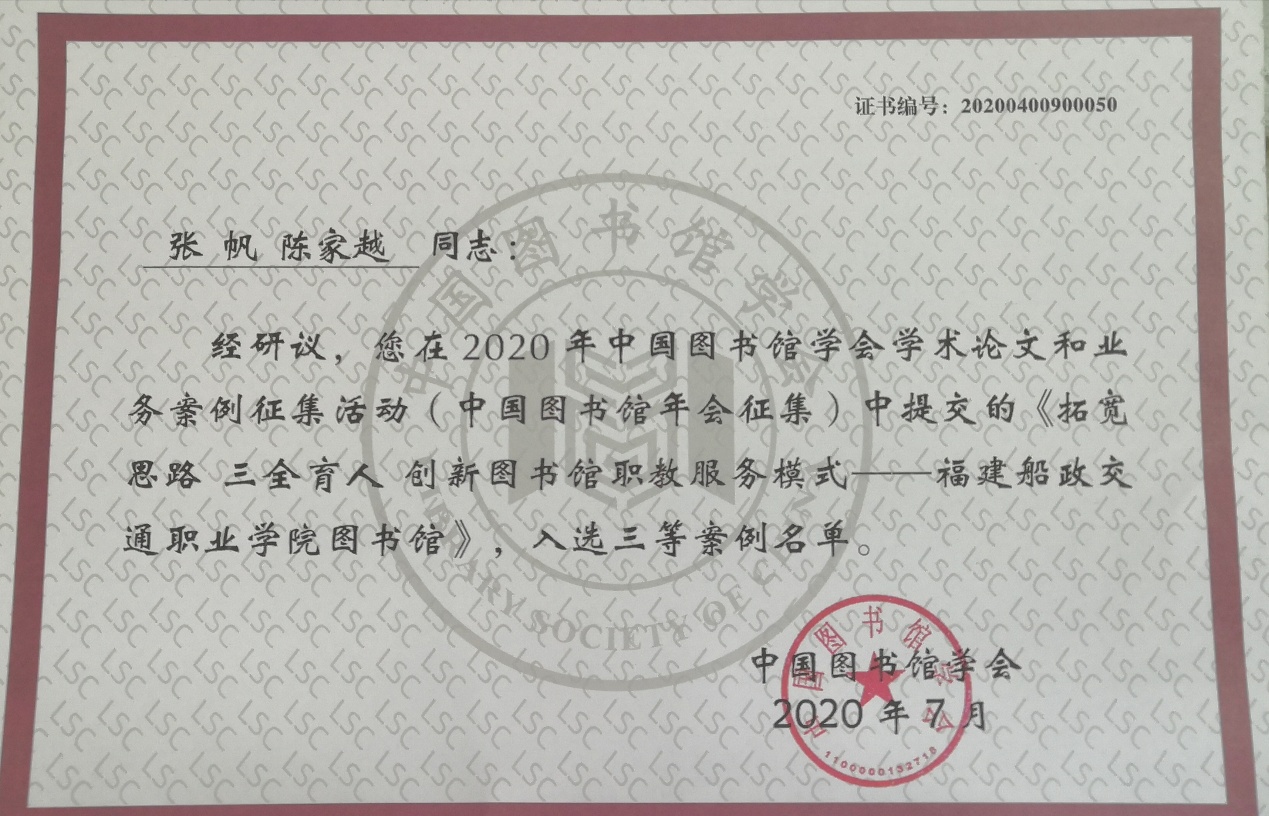 2020年,中國(guó)圖書(shū)館學(xué)會(huì)主辦了以“滋養(yǎng)民族心靈 培育文化自信”為主題的中國(guó)圖書(shū)館學(xué)會(huì)學(xué)術(shù)論文和業(yè)務(wù)案例征集活動(dòng),共設(shè)38個(gè)分主題,分為“中國(guó)圖書(shū)館年會(huì)征集”和“專題交流活動(dòng)征集”兩個(gè)大類組織實(shí)施。本次征集活動(dòng)共計(jì)征集稿件1200余篇,經(jīng)各專家組和研議會(huì)綜合評(píng)定,我館選送的業(yè)務(wù)案例《拓寬思路 三全育人創(chuàng)新圖書(shū)館職教服務(wù)模式》入選三等案例。
