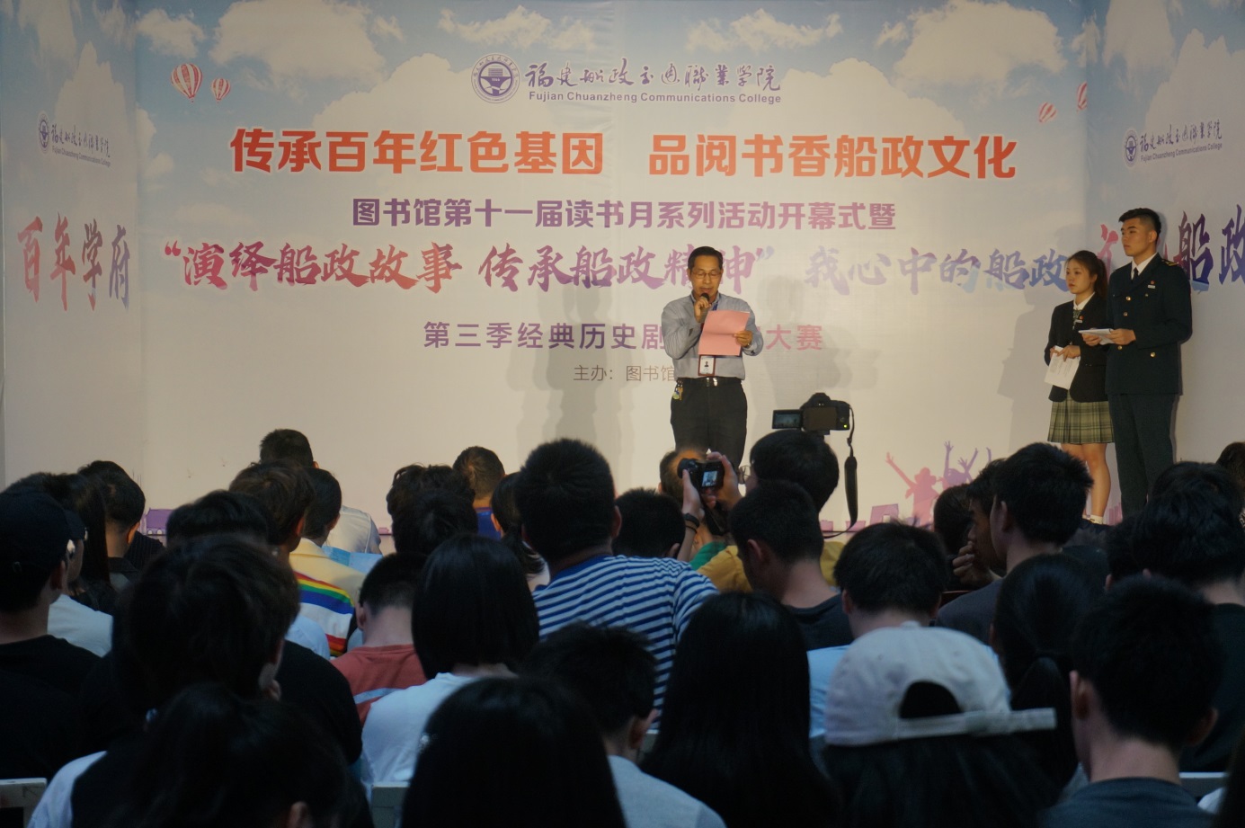 開幕式上,張祖柱副院長(zhǎng)為此次活動(dòng)致辭,鼓勵(lì)廣大師生多讀書、讀好書,充分肯定了本次活動(dòng)的重要意義,并為圖書館學(xué)生館員聯(lián)合會(huì)青年志愿者“愛心大使”頒獎(jiǎng)。同時(shí),還舉行了“我心中的船政-----第三季經(jīng)典歷史劇目展演”大賽決賽活動(dòng),通過形式多樣的藝術(shù)表現(xiàn)形式,把船政文化生動(dòng)地呈現(xiàn)給現(xiàn)場(chǎng)的評(píng)委老師以及觀眾。最終,來自安環(huán)學(xué)院的《甲午海戰(zhàn)中英勇赴海的鄧世昌》話劇作品,獲得此次比賽的一等獎(jiǎng)。