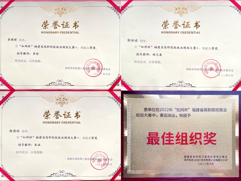 6月1日,歷時(shí)2個(gè)月的“知網(wǎng)杯”福建省高職院校就業(yè)規(guī)劃大賽落下帷幕。我院三名學(xué)子李輝輝(指導(dǎo)老師:李想)、郭詩(shī)琪(指導(dǎo)老師:林元春)、賴燕玲(指導(dǎo)老師:朱涵)從全省眾多參賽學(xué)子中脫穎而出,分別獲得二等獎(jiǎng)2項(xiàng),三等獎(jiǎng)1項(xiàng),三位指導(dǎo)老師被評(píng)為優(yōu)秀指導(dǎo)教師,我院榮獲最佳組織獎(jiǎng)。